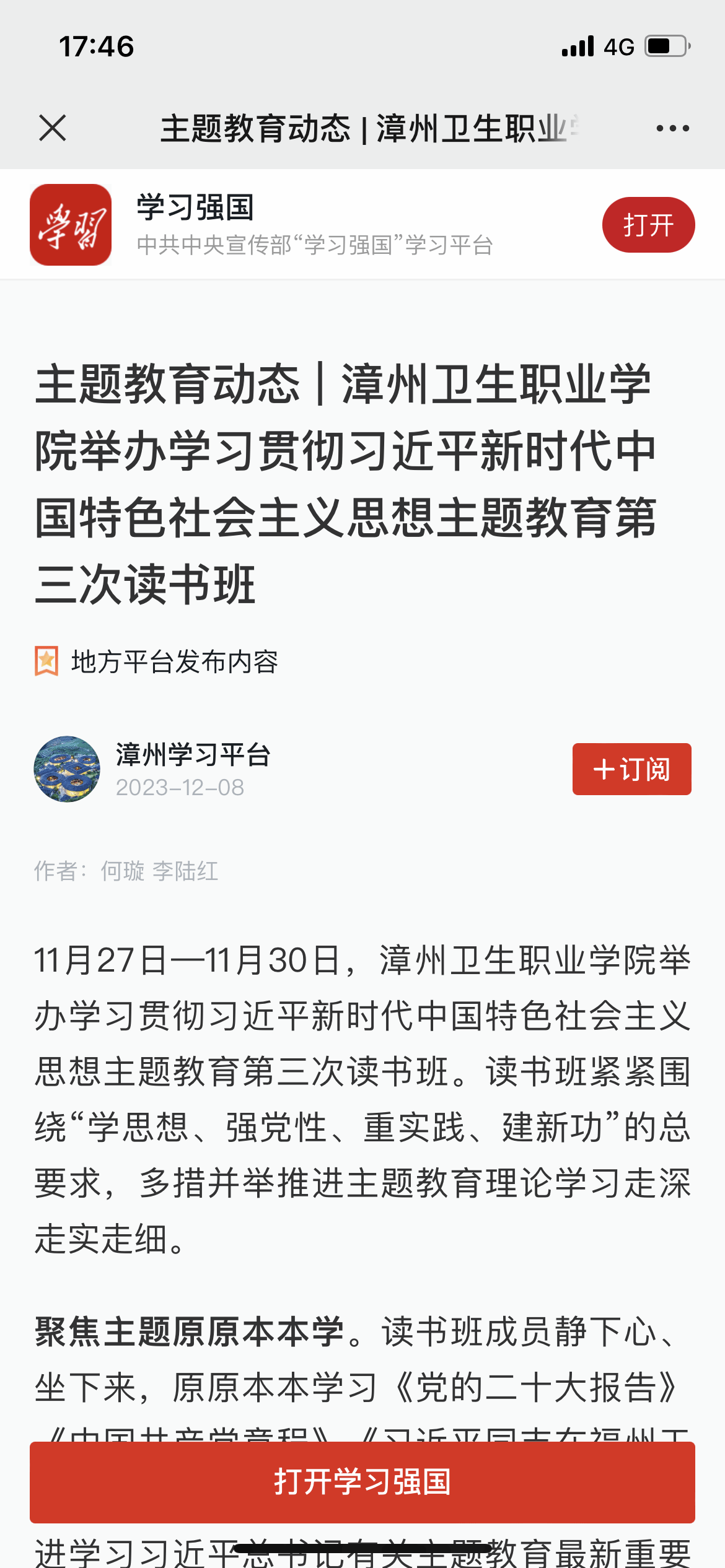 学习强国:主题教育动态|漳州卫生职业学院开展主题教育第三次读书班现场教学暨党委理论学习中心组(扩大)会
