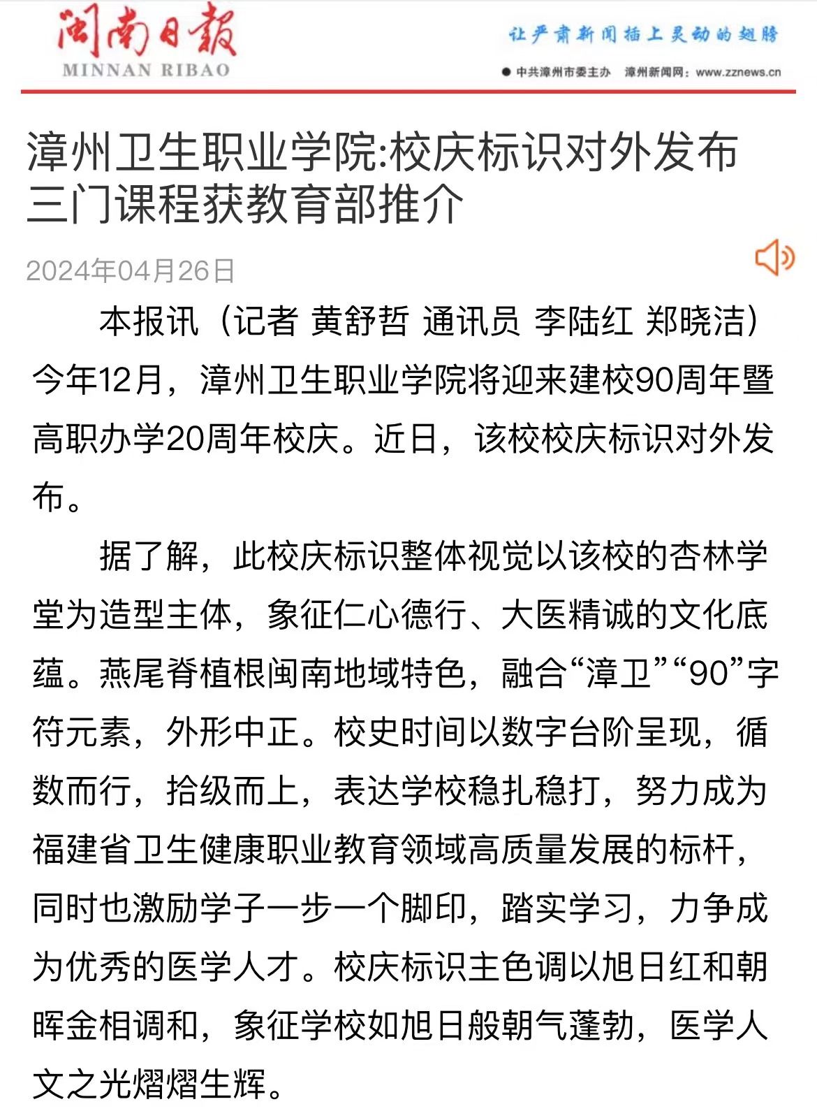 闽南日报:漳州卫生职业学院校庆标识对外发布