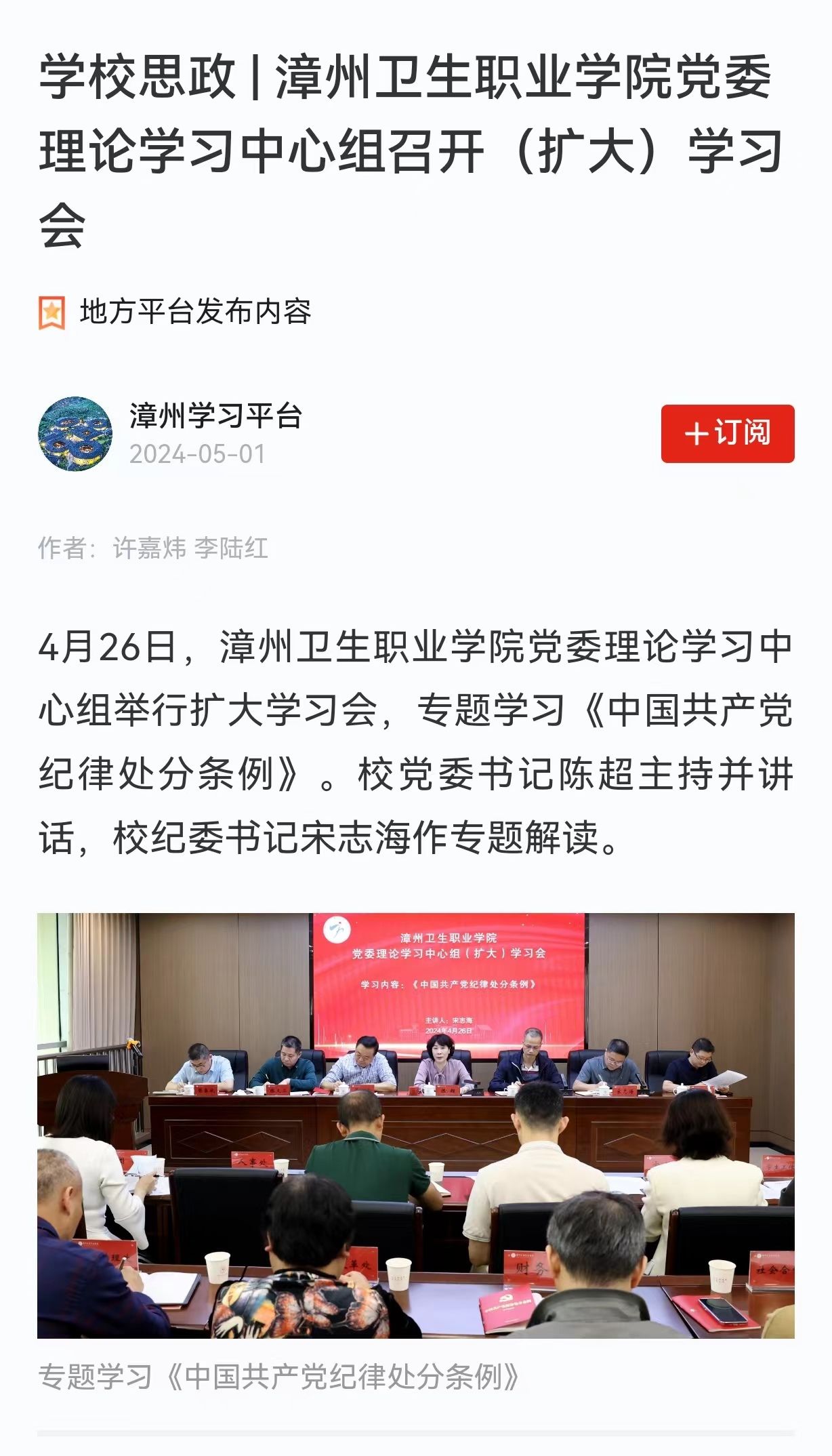 学习强国:学校思政|漳州卫生职业学院党委理论学习中心组召开(扩大)学习会