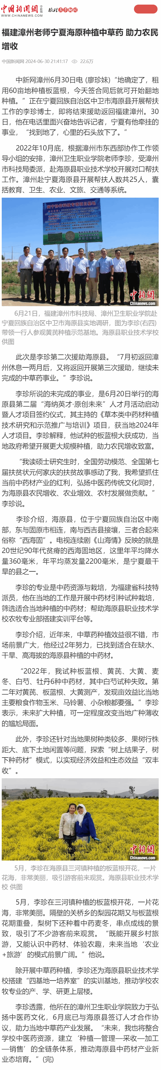 中国新闻网:福建漳州老师宁夏海原种植中草药 助力农民增收