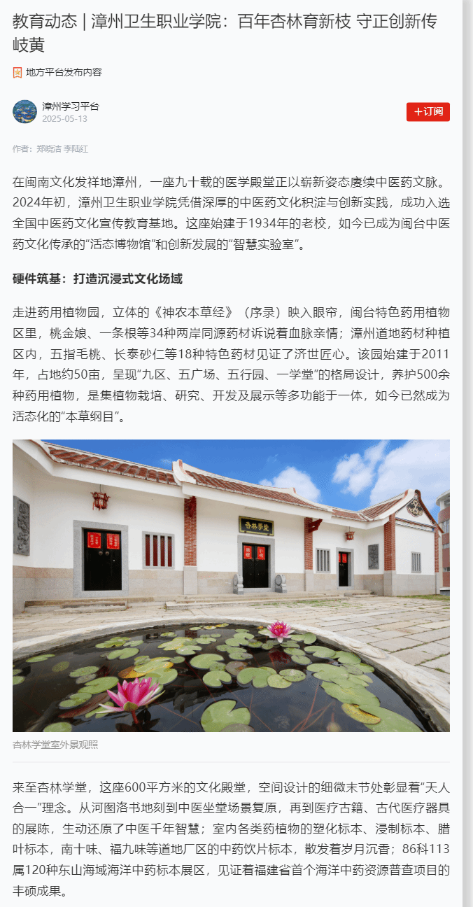 学习强国:教育动态 | 漳州卫生职业学院:百年杏林育新枝 守正创新传岐黄