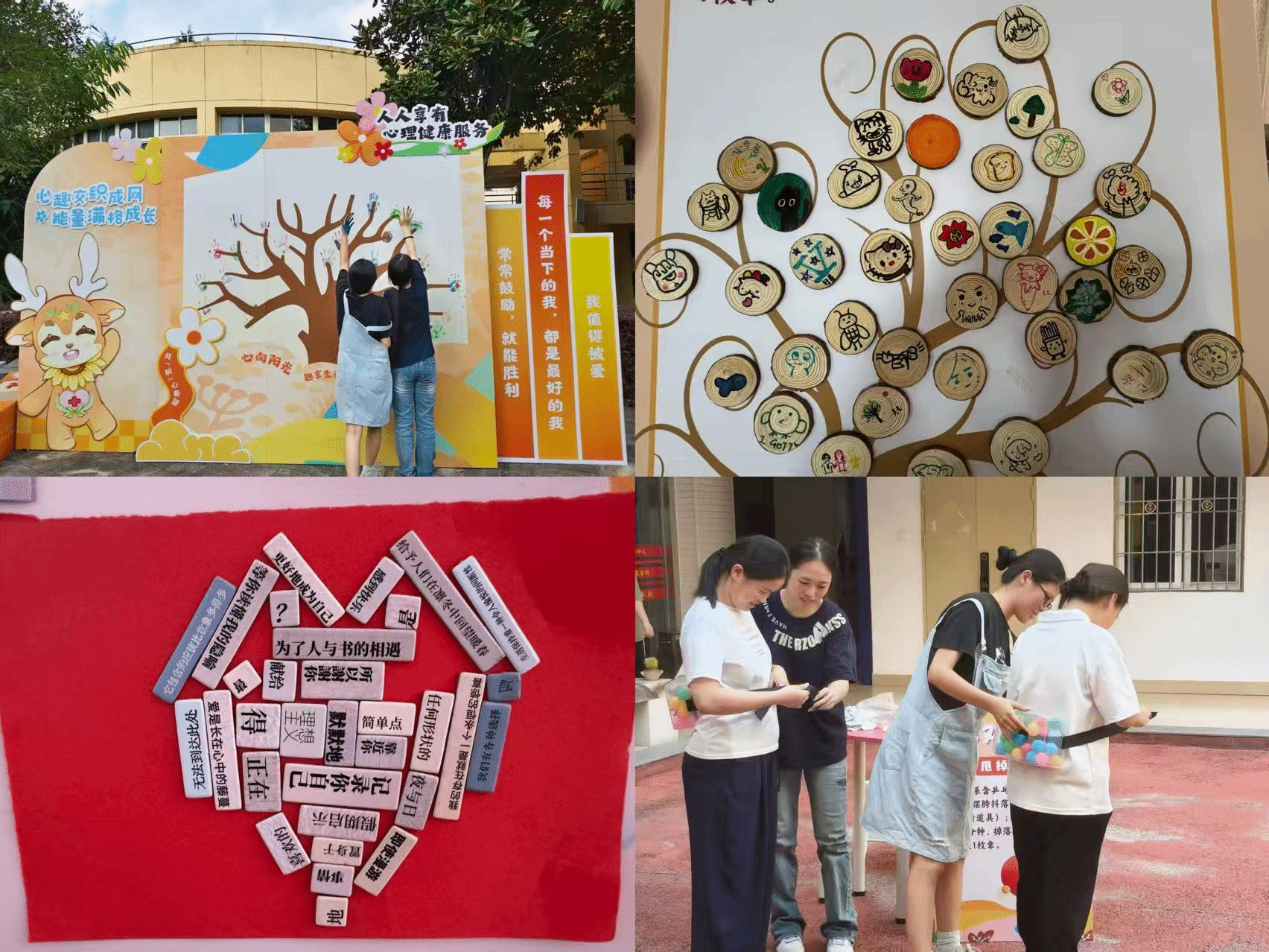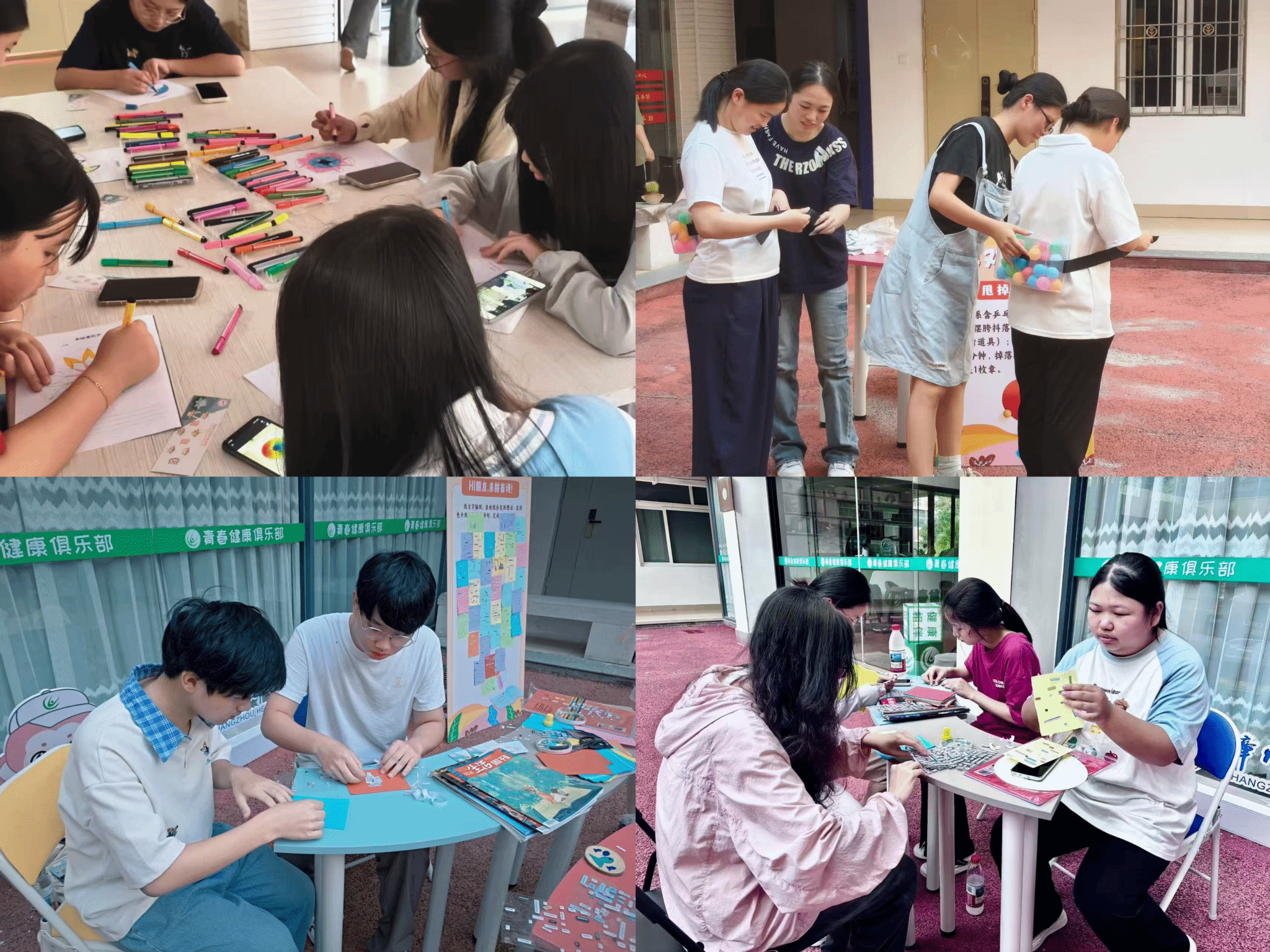活动现场,同学们在“共‘树’心希望”中,用彩色手印拼出一片生命之林;“花开有时,绘心当下”曼陀罗涂色释放内心的色彩与情绪;“HI朋友,来拼首诗!”文字贴纸拼贴出专属心情诗句;“生命之树”描绘个人生命年轮,串联成集体的成长故事;“甩掉压力”抖落乒乓球将烦恼一扫而空;“你演我猜”肢体语言传递默契与欢乐。现场还设置了心理健康知识宣传区,通过大屏幕滚动播放优秀心理海报展、优秀心理健康微视频,将心理健康理念以直观、生动的方式传递给每一位同学。