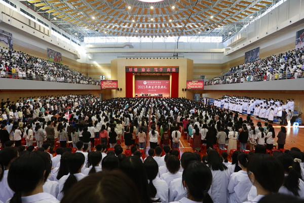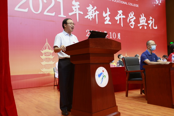 10月26日下午,漳州卫生职业学院2021年新生开学典礼在体育艺术中心隆重举行。学院领导沈国星、黄乃光、宋志海、沈小美、陈义三出席开学典礼,相关职能部门负责人、各系党政负责人、部分师生代表及2021级全体新生参加开学典礼,典礼由党委副书记黄乃光主持。