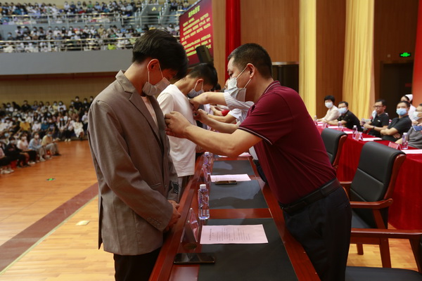 典礼过程中还进行了校徽佩戴仪式,院领导为新生代表佩戴校徽,全场新生一起戴上校徽,正式成为漳州卫生职业学院一份子。