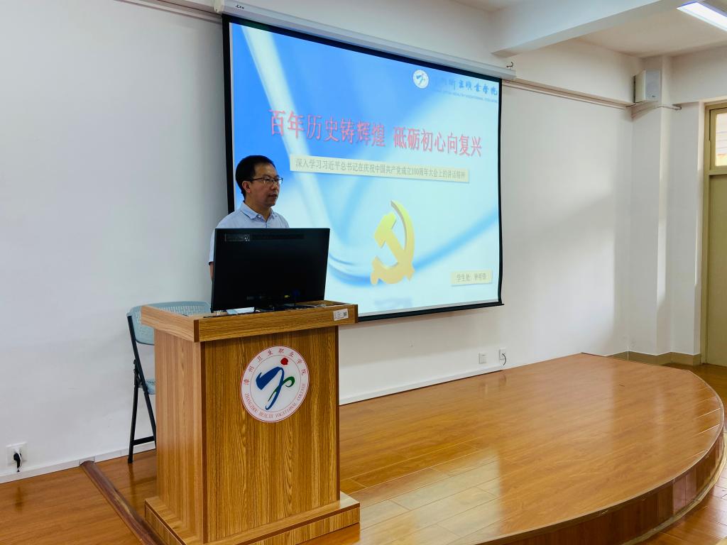 学生处处长从深刻把握习近平总书记“七一”重要讲话的重大意义,始终坚定创造历史伟业的信仰、信念和信心;深刻领会习近平总书记“七一”重要讲话的丰富内涵,不断汲取奋进新征程的智慧和力量;全面落实习近平总书记“七一”重要讲话的实践要求,勇担新时代新发展的使命责任等三个方面进行宣讲,希望全体党员和同学们要把思想和认识统一到学习贯彻习近平总书记“七一”重要讲话精神上来,切实在学懂弄通做实上下功夫;要把学习习近平总书记“七一”重要讲话精神作为党史学习教育的重要内容,兴起党史学习教育新热潮;要将学习习近平总书记“七一”重要讲话精神的成效转化为推动发展的强大动力,实现高质量发展。