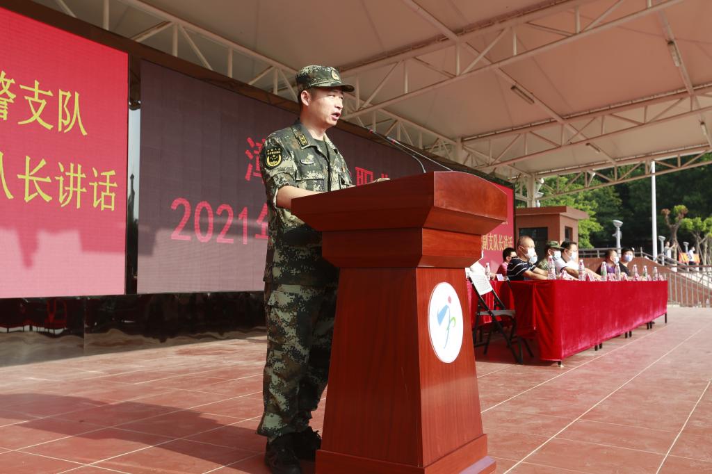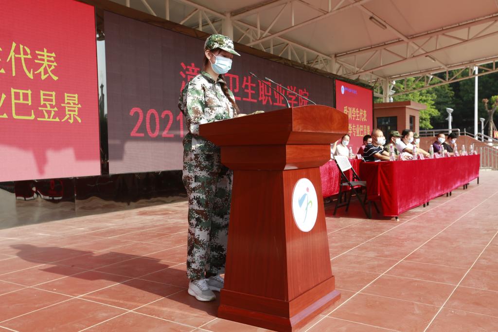 受训学生代表药学系2021级中药学专业巴昱景同学代表2021级全体新生,表示一切行动听指挥,全副身心投入到军训和疫情防控工作中,展现漳卫学子的青春风采。
