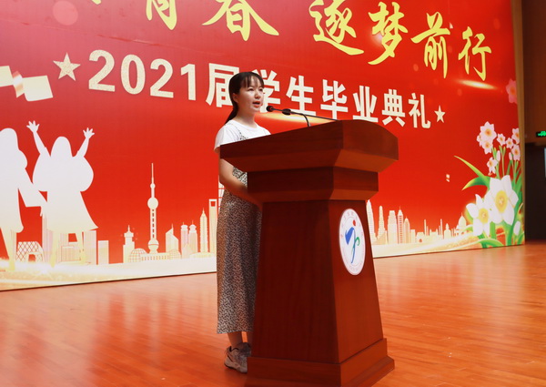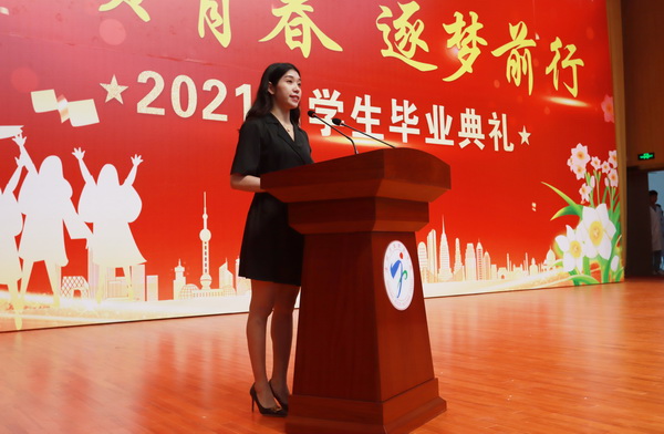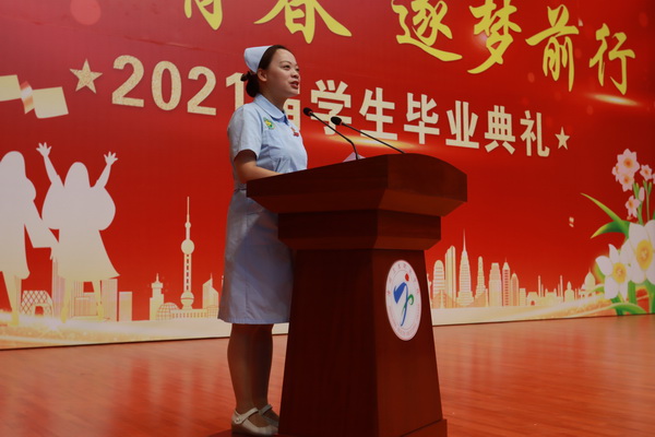 护理系黄臻颖老师代表全体教师向2021届毕业生表达了真诚的祝福和良好的祝愿,希望大家始终不惧风雨,除人类之病痛,助健康之完美,不负母校之教诲,担当起“健康所系,性命相托”的这份责任。