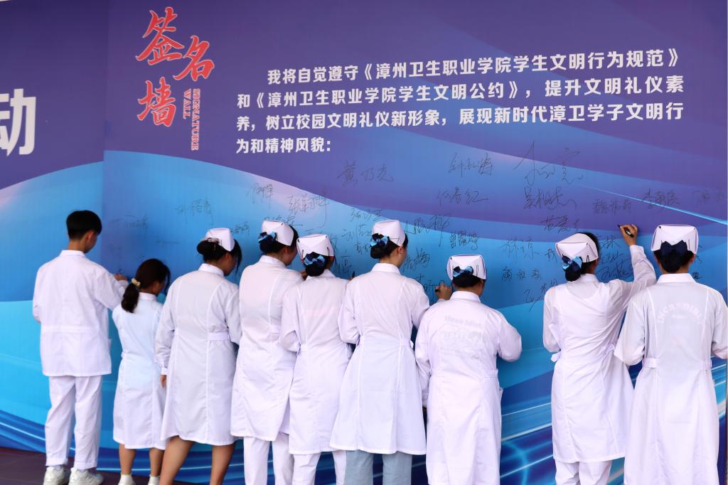 师生代表纷纷在签名墙上郑重签名,庄严承诺在今后的学习生活中的说文明话、办文明事、做文明人,用青春和实际行动唱响文明的音符,共同书写校园文明的新篇章。