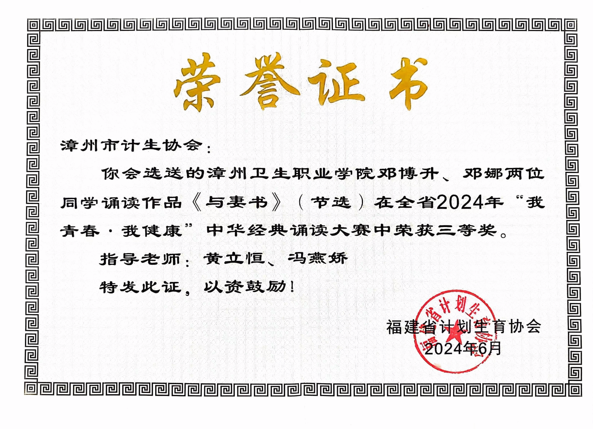 近日,2024年“我青春·我健康”中华经典诵读大赛活动,我校《与妻书》(节选)从全省36所高校投稿的68件作品中脱颖而出,获评省级三等奖。