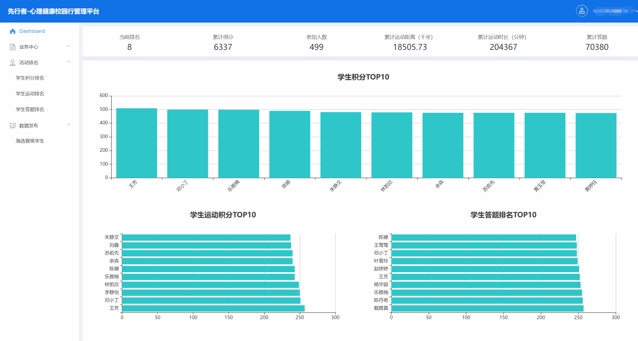 活动一经发布,受到了广大同学的广泛关注和踊跃报名,来自各学院499名学生积极参与。同学们结合自身情况,每天以软件运动记录截图、拍摄运动照片的形式进行跑步打卡,同时通过线上答题程序进行每日心理知识学习打卡。据统计,目前我校234名同学坚持完成21天打卡任务,其中58名同学在打卡活动中2项任务均为满分。在全国百所高校的排名中,我校位列第8位,累计运动距离达到1.85万公里,累计答题7万多道题。