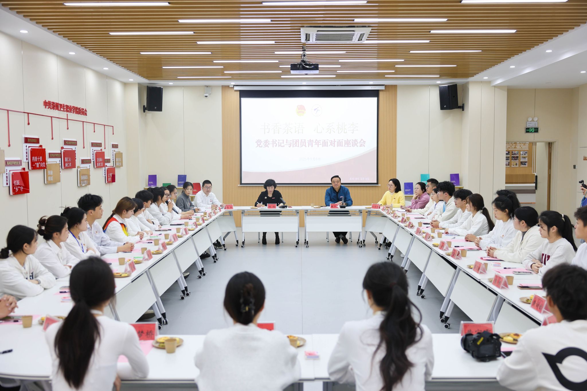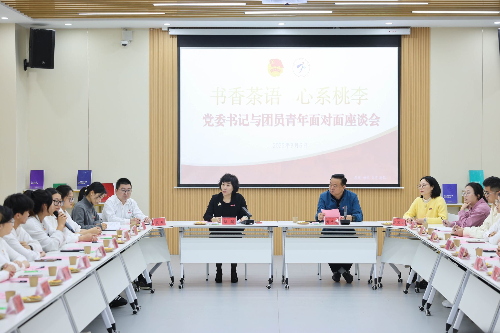 为深化“一站式”学生社区建设,推动社团活动与社区育人深度融合,3月6日下午,我校以“书香茶语,心系桃李”为主题的党委书记与团员青年面对面座谈会在图书馆一楼党建活动中心举行。校党委书记陈超与来自学校各社团的团员青年代表围坐一堂,以书为媒、以茶会友,共话理想信念,畅谈成长担当。校党委副书记黄乃光和相关部门负责人陪同。