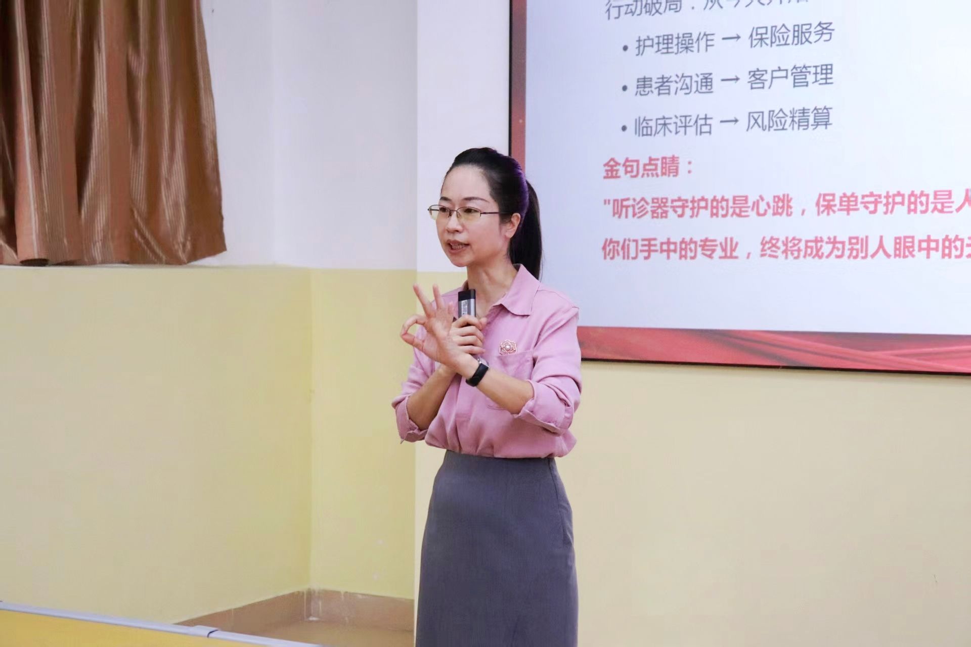 郭亚绒以“从救治生命到守护幸福”为主线,结合自身从临床护理到保险管理的跨界经历,分享了“内外职业生涯”的实践感悟。她指出,护理专业所培养的应急决策力、人文共情力等核心素养,可成功迁移至保险等行业,实现“内职业生涯”的有机延伸。围绕新生成长规划,她提出三点建议:夯实专业“硬实力”,掌握基础技能,培养临床思维;拓展跨界“软潜能”,通过选修课程、专升本等方式提升综合素质;永葆职业“初心力”,以医学人文精神赋能未来职业发展。