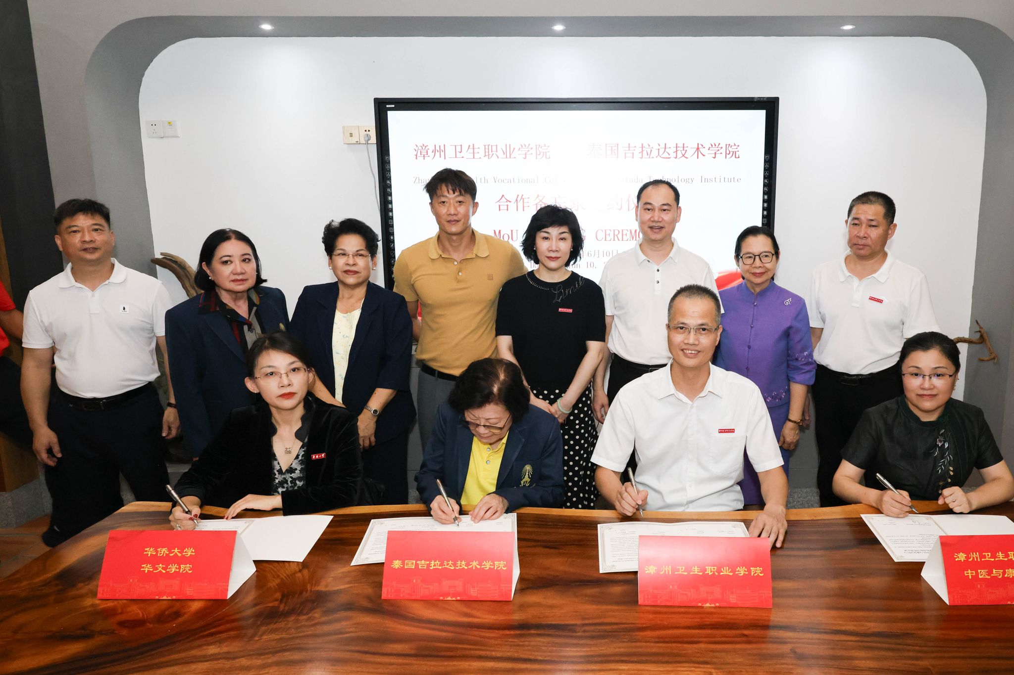 访问期间,我校分别与泰国吉拉达科学技术学院、华侨大学华文学院签署了友好合作备忘录,并赠送中医药文化纪念品。双方围绕职业教育特色发展、师生互访及华文教育推广等核心议题,展开了深入座谈,共商合作路径。校领导表示,本次签约既是深化国际交流的重要突破,也是职业教育服务“一带一路”的具体实践,期待以此为起点,与各方构建“资源共享、优势互补、协同发展”机制,推动师生素养提升与华文教育焕新,将成果转化为服务区域经济、促进民心相通的实效。学校将持续依托卫生健康领域优势,通过建设海丝学院、开展“中文+适宜技术技能”培训、输出课程标准等举措,为职教“走出去”注入漳卫智慧。
