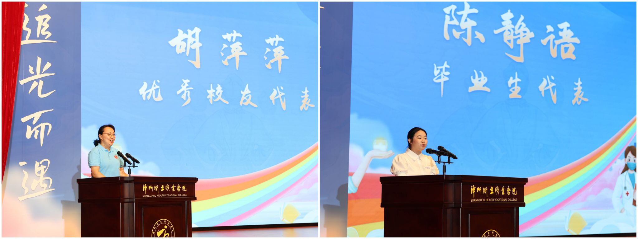 1999届社区医学专业校友胡萍萍、临床医学院学生陈静语分别作为优秀校友代表、毕业生代表发言,表达了以所学守护健康、不负母校培育的坚定决心,发言温情与热血交织,赢得全场掌声如潮。