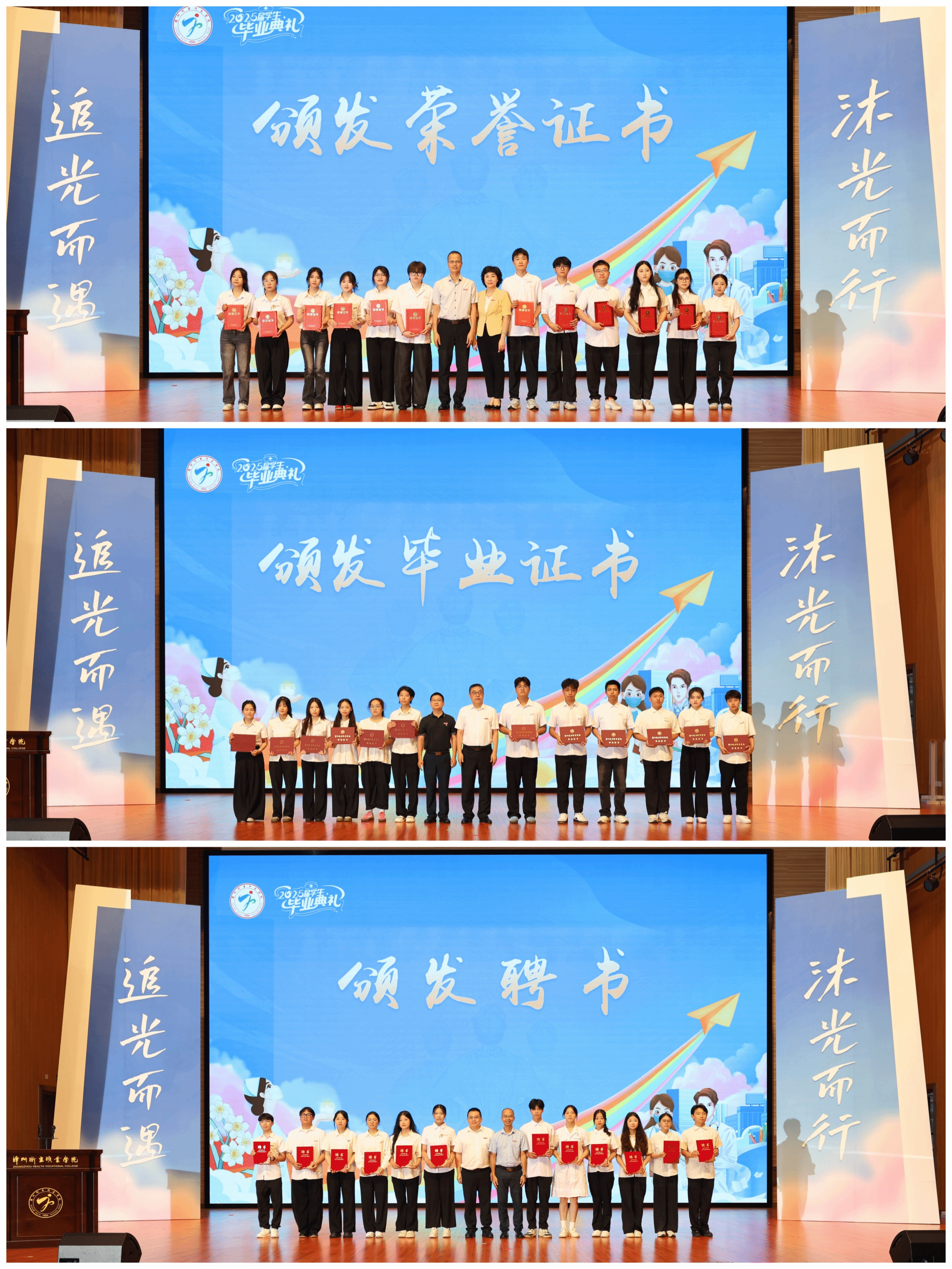 典礼由副校长陈义三主持,副校长张春斌宣读2025届优秀毕业生名单,校领导分别为优秀毕业生、毕业生代表以及2025届校友联络员代表颁发证书。