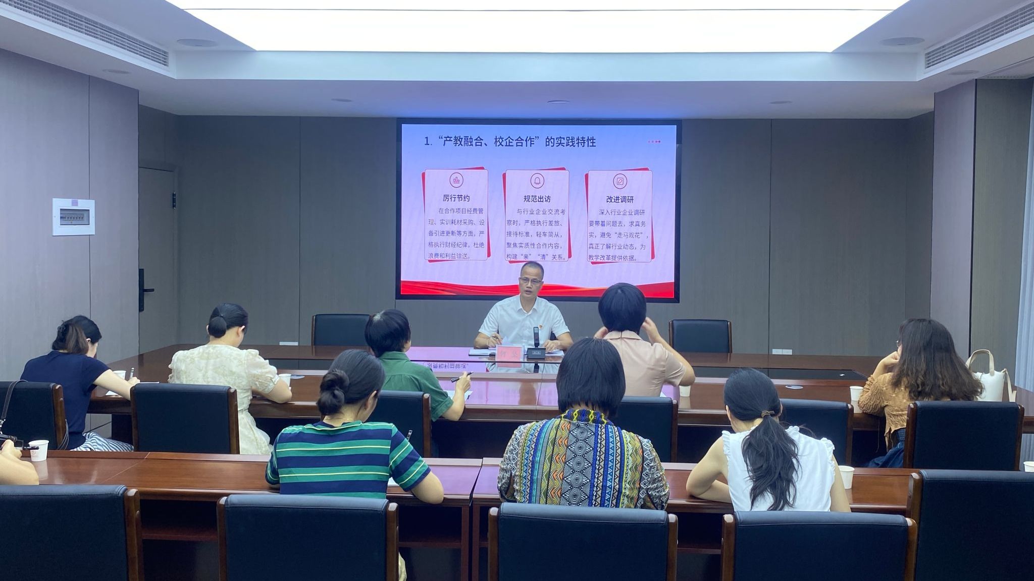 何坚围绕历史背景、政治意义及职业教育特殊要求三个维度展开论述,深入阐释了中央八项规定精神通过重塑党的执政根基、净化政治生态、提升治理效能,为全面从严治党奠定坚实基础。他指出,职业教育在落实中央八项规定精神上肩负着特殊使命,必须紧密结合产教融合、双师型队伍建设、实践育人等职教特色,将严的基调贯穿办学治校全过程。全体教师要提高政治站位,筑牢育人初心。深刻认识为党育人、为国育才的政治责任,把中央八项规定精神作为师德师风建设的标尺,坚决抵制“四风”问题,在课堂教学、实习实训中传递清正廉洁的价值导向。要聚焦职教特点,严把廉洁关口。在校企合作、实训耗材采购、技能评价等关键环节,严格执行财经纪律,构建“亲”“清”校企关系,杜绝利益输送和学术不端。要弘扬务实作风,提升育人实效。要力戒形式主义,减少不必要的会议、表格和检查,把更多精力投入到教学改革和学生培养中,以“大医精诚”的职业精神培育学生仁心仁术。