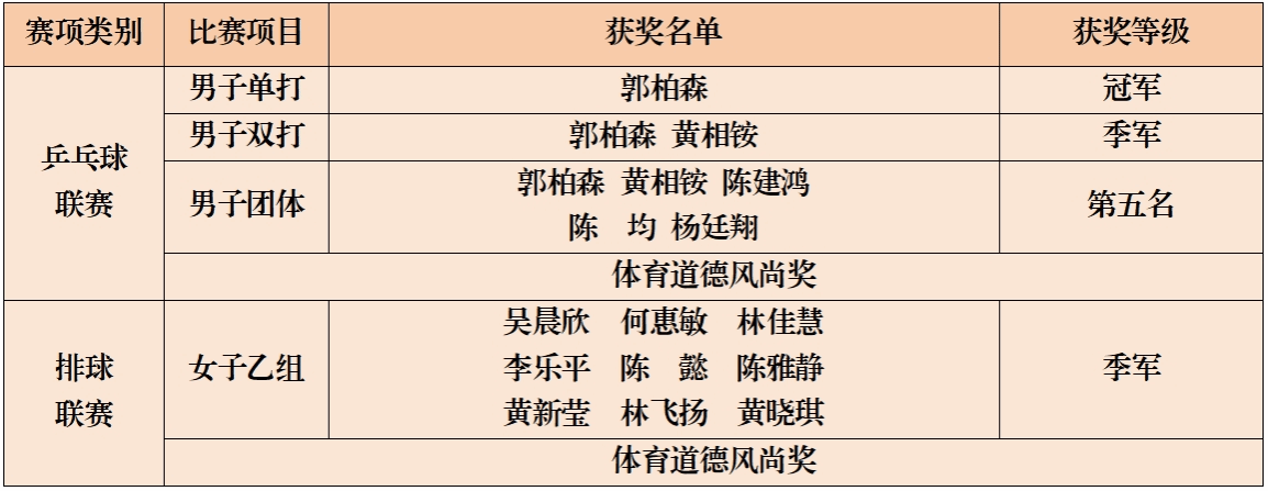 近日,2025年福建省大学生排球、乒乓球联赛在激烈的角逐中圆满落下帷幕。我校运动健儿在两项赛事中表现优异,共斩获1金2铜及体育道德风尚奖等多项荣誉。