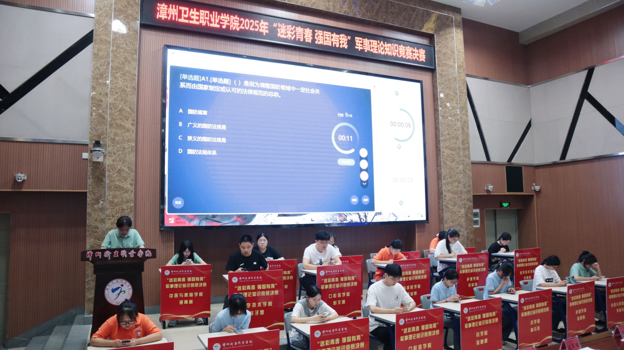 为贯彻落实习近平总书记关于加强全民国防教育的重要指示和全国教育大会精神,纪念中国人民抗日战争暨世界反法西斯战争胜利80周年,切实提升青年学生的国防意识和军事素养,10月10日晚,我校2025年“迷彩青春 强国有我”军事理论知识竞赛决赛在学术报告厅火热开赛。