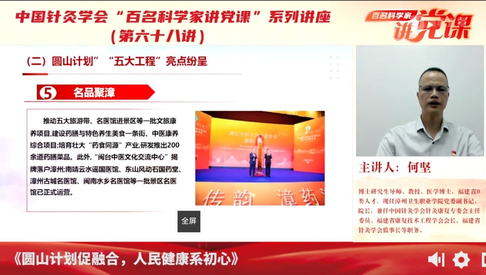 为深入学习贯彻习近平新时代中国特色社会主义思想,贯彻落实全国科技大会精神,根据中国针灸学会“百名科学家讲党课”系列讲座栏目安排,10月29日下午,中国针灸学会针康专委会主任委员,福建省康复技术工程学会会长,福建省针灸学会监事长,学校党委副书记、校长何坚为全国针灸同仁讲授了一堂题为“圆山计划促融合,人民健康系初心”的精彩讲座,讲座由中国针灸学会党委副书记、副会长兼秘书长景向红主持。