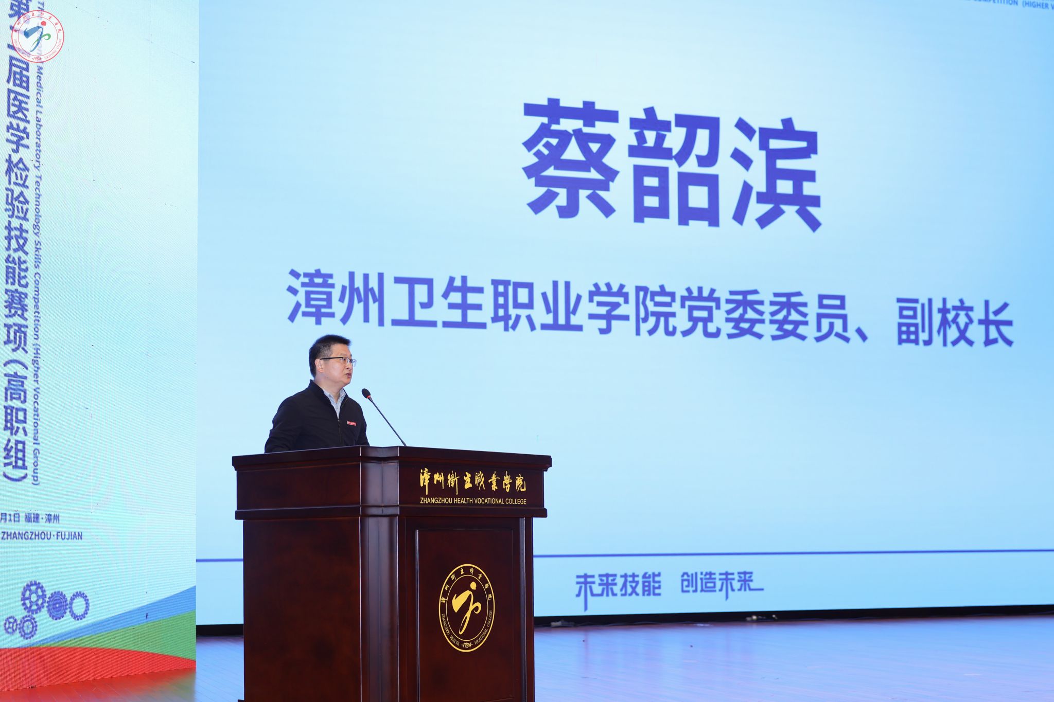 蔡韶滨在致辞中向获奖选手和单位表示祝贺,并对大赛组委会、裁判专家及全体工作人员表示感谢。他表示,作为承办单位,学校高度重视本次大赛的组织与服务工作,全力保障赛事顺利举行。大赛不仅为各院校搭建了高水平的交流平台,也全面展示了我校医学检验技术专业在人才培养、实践教学与产教融合方面的积极探索与扎实成效。学校将以此次大赛为契机,持续深化“五金”建设,推进专业建设与产业需求对接,助力职业教育国际化发展,为服务“健康中国”战略培养更多高素质技术技能人才,贡献应有的力量。