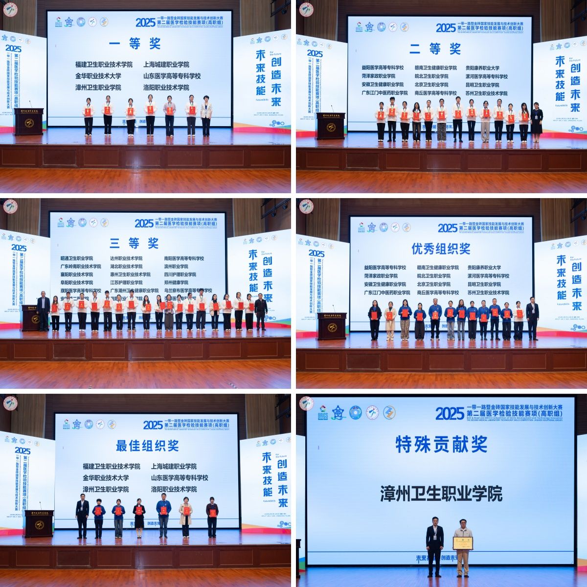 闭幕式上,赛项裁判长张纪云教授对赛事进行点评,赛项仲裁长郭晓临教授宣布了获奖名单。与会领导、专家分别为获奖选手及获奖单位颁奖。本次大赛共评选出一等奖6支队伍、二等奖12支队伍、三等奖18支队伍,及优秀组织奖、最佳组织奖和突出贡献奖。其中,福建卫生职业技术学院、金华职业技术大学获国内赛项前两名,取得2026年国际赛优先参赛资格;我校凭借出色的赛事组织与服务工作,荣获“突出贡献奖”。