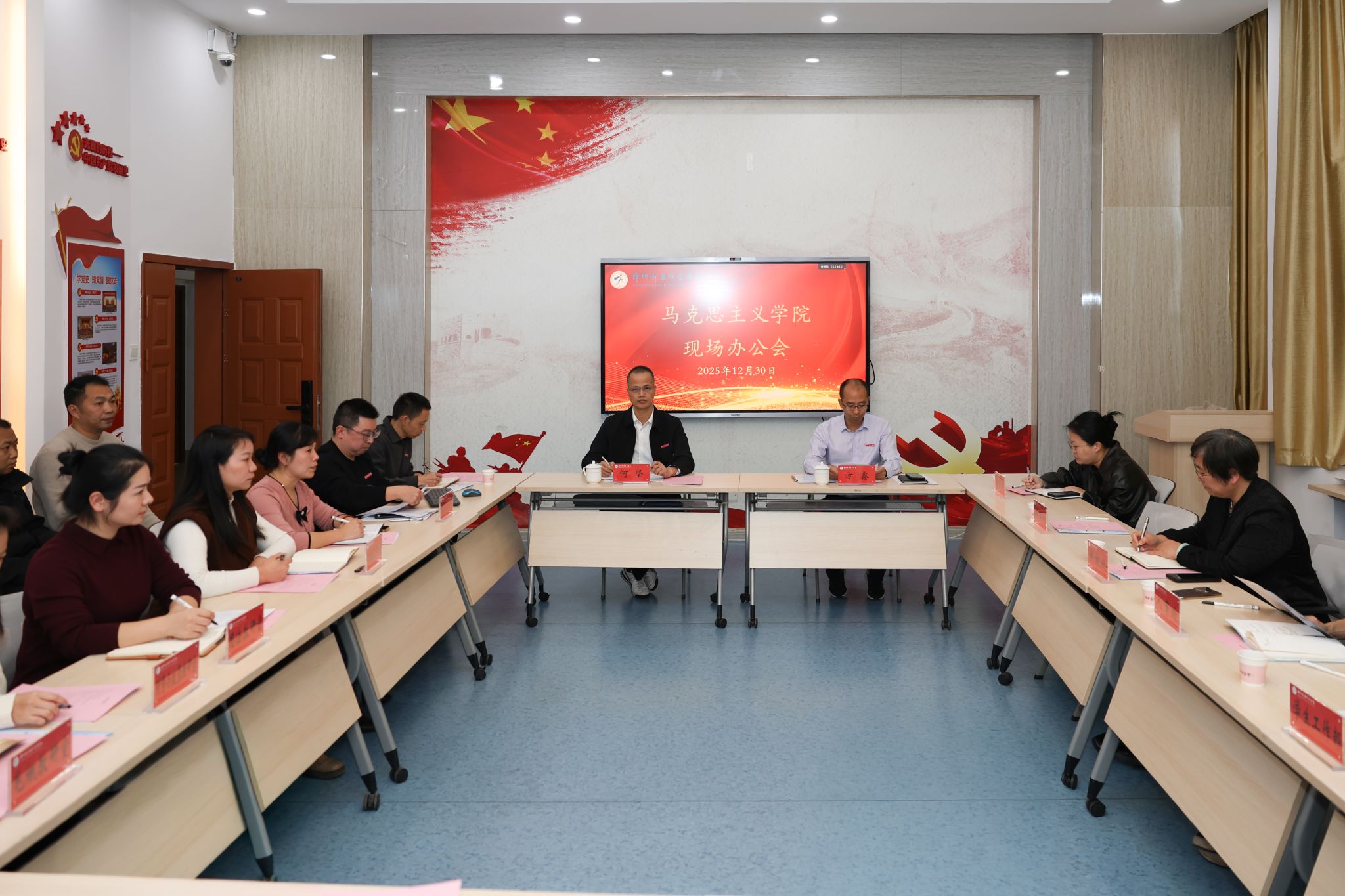 为深入学习贯彻党的二十届四中全会精神,落实立德树人根本任务,推动学校思政课建设高质量发展,12月30日,校长何坚深入马克思主义学院召开思政课建设现场办公会。会议由党委委员、党政办公室主任方鑫主持。