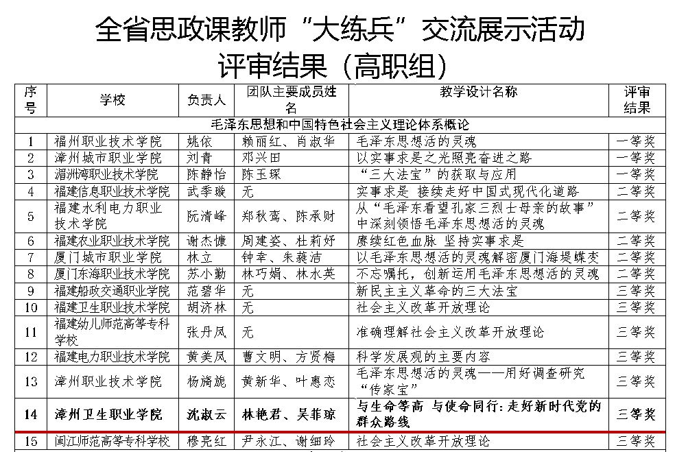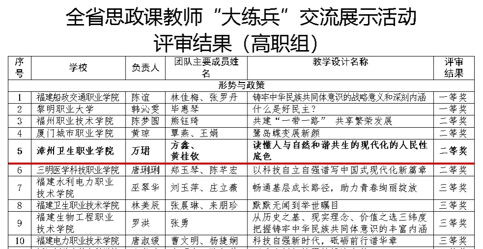 近日,福建省教育厅公布福建省思政课教师“大练兵”交流展示活动评审结果,我校万珺、方鑫、黄桂钦教师团队《读懂人与自然和谐共生的现代化的人民性底色》作品荣获《形势与政策》课程二等奖,沈淑云、林艳君、吴菲琼教师团队《与生命等高,与使命同行:走好新时代党的群众路线》作品荣获《毛泽东思想和中国特色社会主义理论体系概论》课程三等奖。