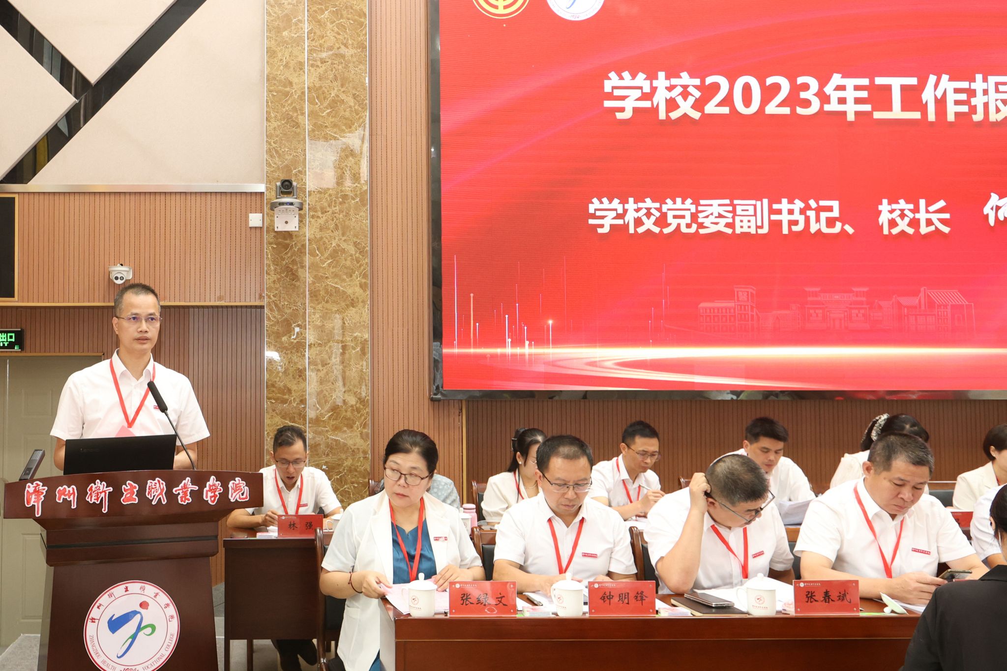 校长何坚在会上作2023年工作报告,全面总结了学校所取得的成绩,并对下阶段的工作进行了部署。报告指出,学校要锚定新“双高”建设的目标任务,破壁融合、提质培优,推进高水平专业群建设,开展专业设置可行性论证,打好专业建设“攻坚战”;要引航蓄力、搭台拓渠,推进科技成果转化,打造大健康职业培训中心,强化产业发展有限公司运营管理激活科研服务“动力源”;要引育结合、夯基固本,推进“三定”工作,实施绩效工资改革,完善职称评价机制,办好队伍建设“头等事”;要培根铸魂、启智润心,推进“一站式”学生社区建设,深化“三全育人”综合改革,争当立德树人“先行者”;要软硬兼施、靶向发力,推进11号学生公寓建设,深化法治校园、文明校园和智慧校园建设,打好创新发展“组合拳”。