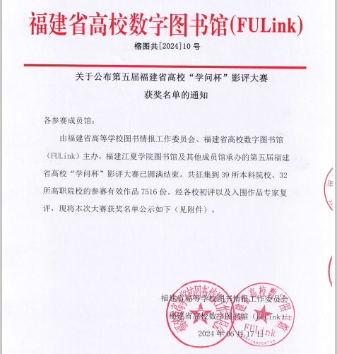 近日,由福建省高等学校图书情报工作委员会、福建省高校数字图书馆(FULink)举办的第五届福建省高校“学问杯”影评大赛圆满结束。