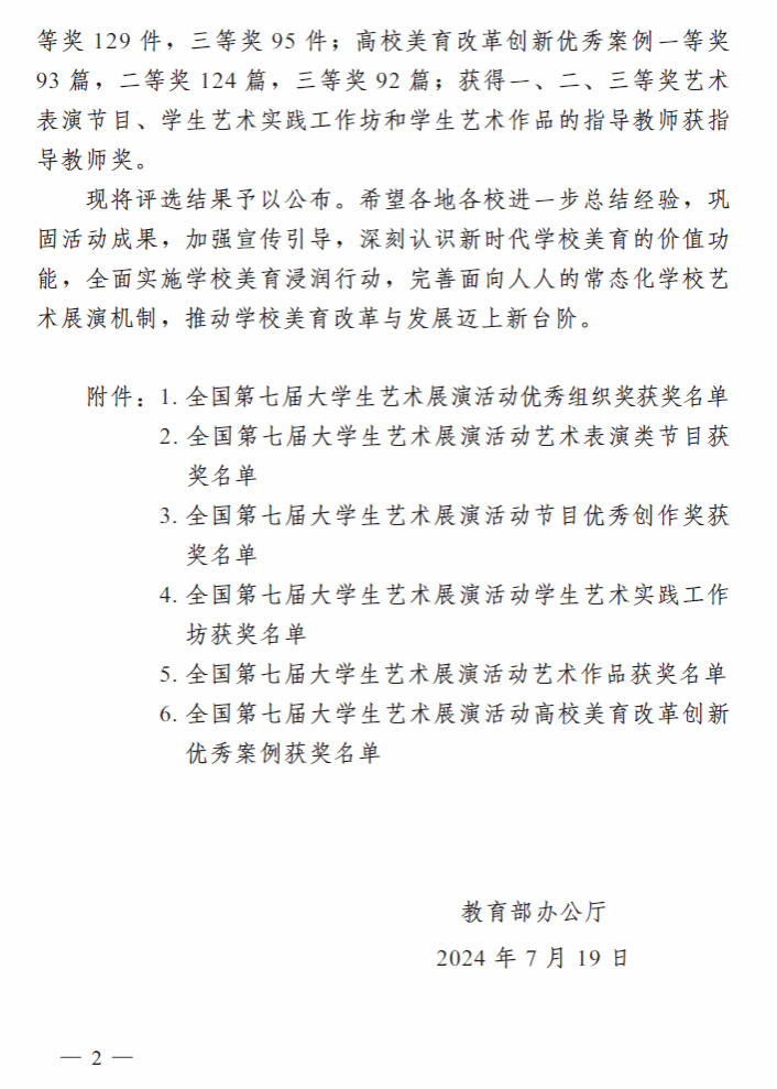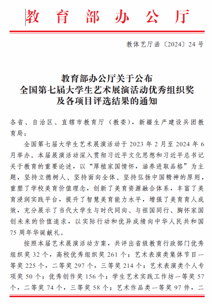 近年来,学校积极贯彻《教育部关于全面实施学校美育浸润行动的通知》的精神,高度重视校园美育工作,本次获奖是学校推进大学美育建设、美育教学改革的新突破。下一步,我校将以此为契机,继续坚持以美育人、以美化人,繁荣校园文化,进一步推动学校美育改革与发展迈上新台阶,以实际行动和优异成绩献礼我校建校90周年暨高职办学20周年。