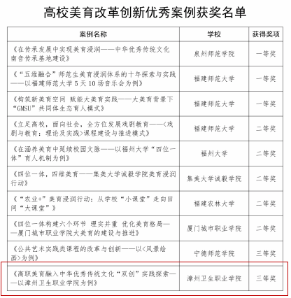 近日,教育部公示了2024年全国第七届大学生艺术展演活动获奖名单。我校通识教育学院颜晓星副教授负责的美育案例《高职美育融入中华优秀传统文化“双创”实践探索——以漳州卫生职业学院为例》,荣获“高校美育改革创新优秀案例”三等奖。