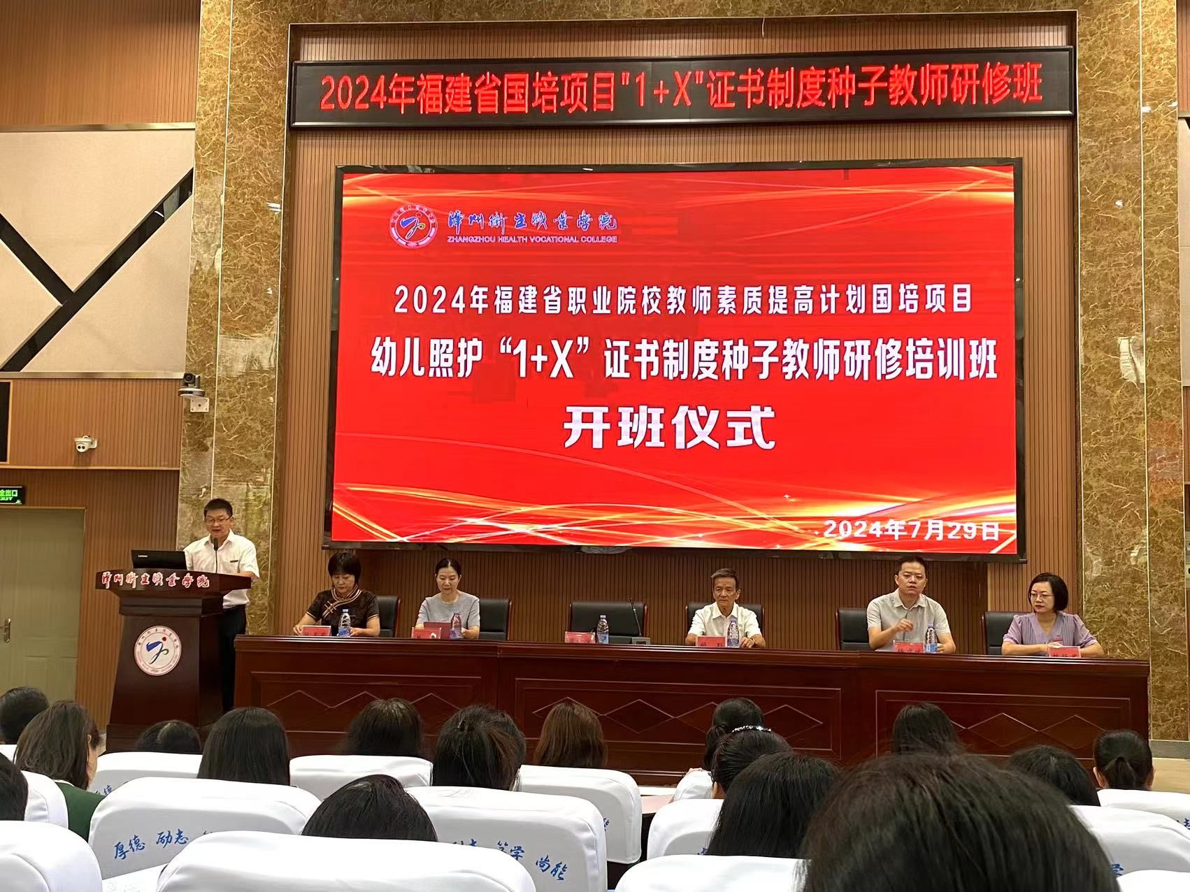 2024年7月29日,福建省2024年国培1+X证书制度种子教师培训幼儿照护研修班在漳州卫生职业学院正式拉开帷幕。教育部高职教育评估专家胡野,漳州卫生职业学院副校长蔡韶滨,漳州卫生职业学院继续教育学院、教师发展中心、护理学院相关负责人出席开班仪式。