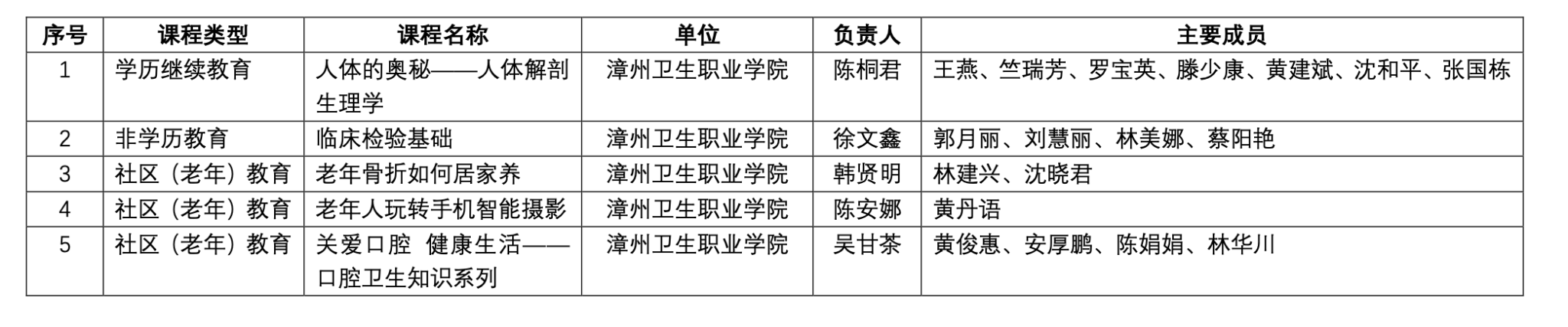 近日,福建省终身教育促进委员会公布了2024年福建省继续教育数字化精品课程认定名单,我校《人体的奥秘——人体解剖生理学》获学历继续教育类别认定;《临床检验基础》获非学历继续教育类别认定;《老年骨折如何居家养》、《老年人玩转手机智能摄影》和《关爱口腔健康生活——口腔卫生知识系列》三门课程获社区(老年)教育课程类别认定。
