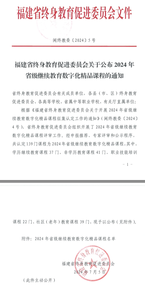 据悉,2024年福建省继续教育数字化精品课程认定活动是教育部职成司征集继续教育数字化资源工作部署的重要内容,本次认定活动汇集了来自100多所本科院校、高职高专、中职学校的继续教育数字化精品课程,经过专家综合评议,全省共认定学历继续教育类课程37个,非学历继续教育类课程41个,社区(老年)教育类课程39个。在此次课程认定中,我校获得的课程认定数量在同类院校中名列前茅。