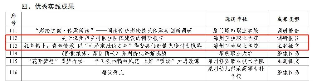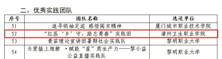 近日,中共福建省委教育工作委员会公布了“追寻领袖足迹 体悟伟大变革”2024年全省大学生暑期社会实践活动评选结果。我校“红医‘乡’守,励志青春”实践团荣获“优秀实践团队”,《关于漳州市乡村医生队伍建设的调研报告》《红色热土,青春传承——以“毛泽东批语之乡”华安县仙都镇先锋村为镜鉴》荣获“优秀实践成果”,是漳州市唯一在此评选中获奖的高职院校。