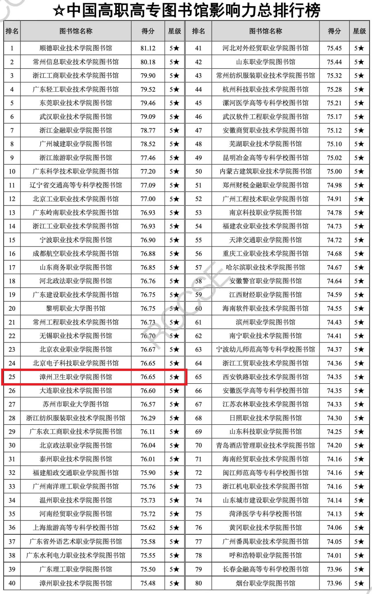 近日,由武汉大学中国科学评价研究中心,中国科学学与科技政策研究会科学计量学与信息计量学专业委员会联合发布《数智时代中国图书馆影响力评价报告(2024)》,我校图书馆凭借其坚实的基础资源、优质的服务质量以及在网络影响力方面的优异表现,荣登全国高职高专图书馆影响力排行榜第25名,福建省第2名,并获得综合影响力5★评价(5★为具有突出影响力的单位,即排在最前面10%的单位)。