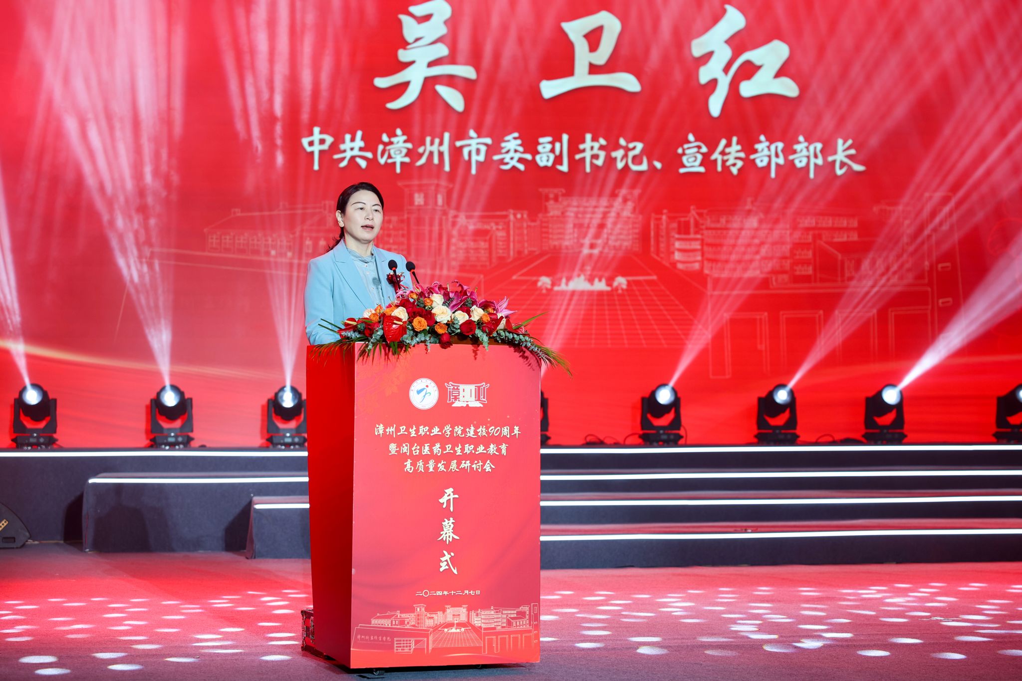 吴卫红在致辞中代表漳州市委、市政府向漳州卫生职业学院建校90周年表示热烈祝贺,向海峡两岸专家学者致以诚挚欢迎。她表示,希望漳卫院深入推进育人方式、办学模式、管理体制改革,不断提升教育教学水平,努力建设特色鲜明的高水平医学名校。希望学校加强基层医疗卫生服务,中医药传承创新发展等课题研究和转换,做强做精中药、医检等优势专业,培养更多高素质、高技能医技人才。希望学校充分发挥在闽台青草药文化交流方面的独特优势,深度参与漳州市“圆山计划”,为推动漳台“五大板块”融合发展,助力两岸融合发展示范区建设做出更大贡献。