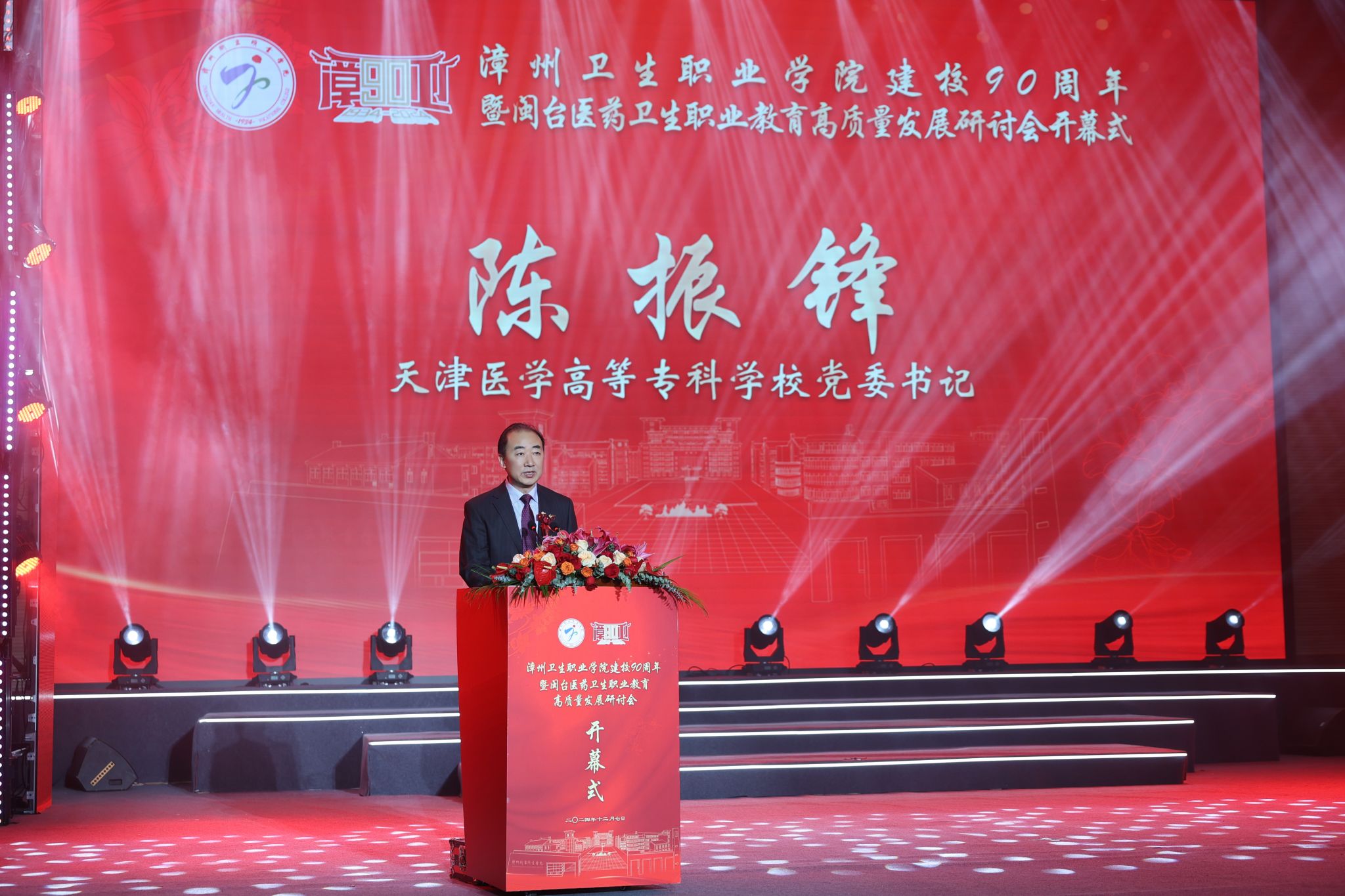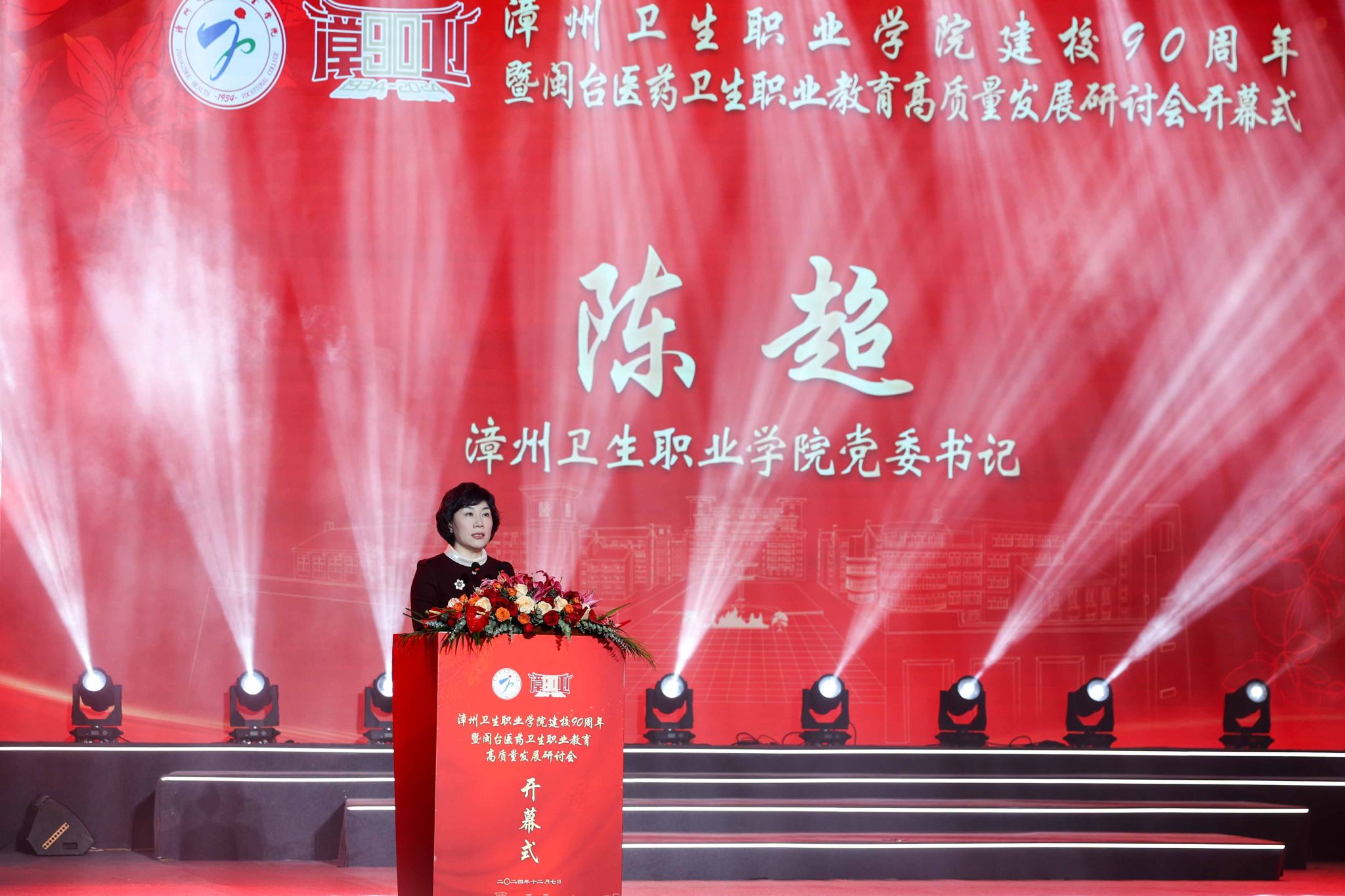 陈超在主持大会中指出,为者常成,行者常至。立足新起点,迈向新征程,学校将以建校90周年为契机,坚持以习近平新时代中国特色社会主义思想和党的二十届三中全会精神为指引,深入学习贯彻习近平总书记在福建、在漳州调研时的重要讲话精神,坚持社会主义办学方向,全面落实立德树人根本任务,扭住目标不放松、一张蓝图绘到底,努力把学校建设成为福建省医药卫生职业教育领域高质量发展标杆。