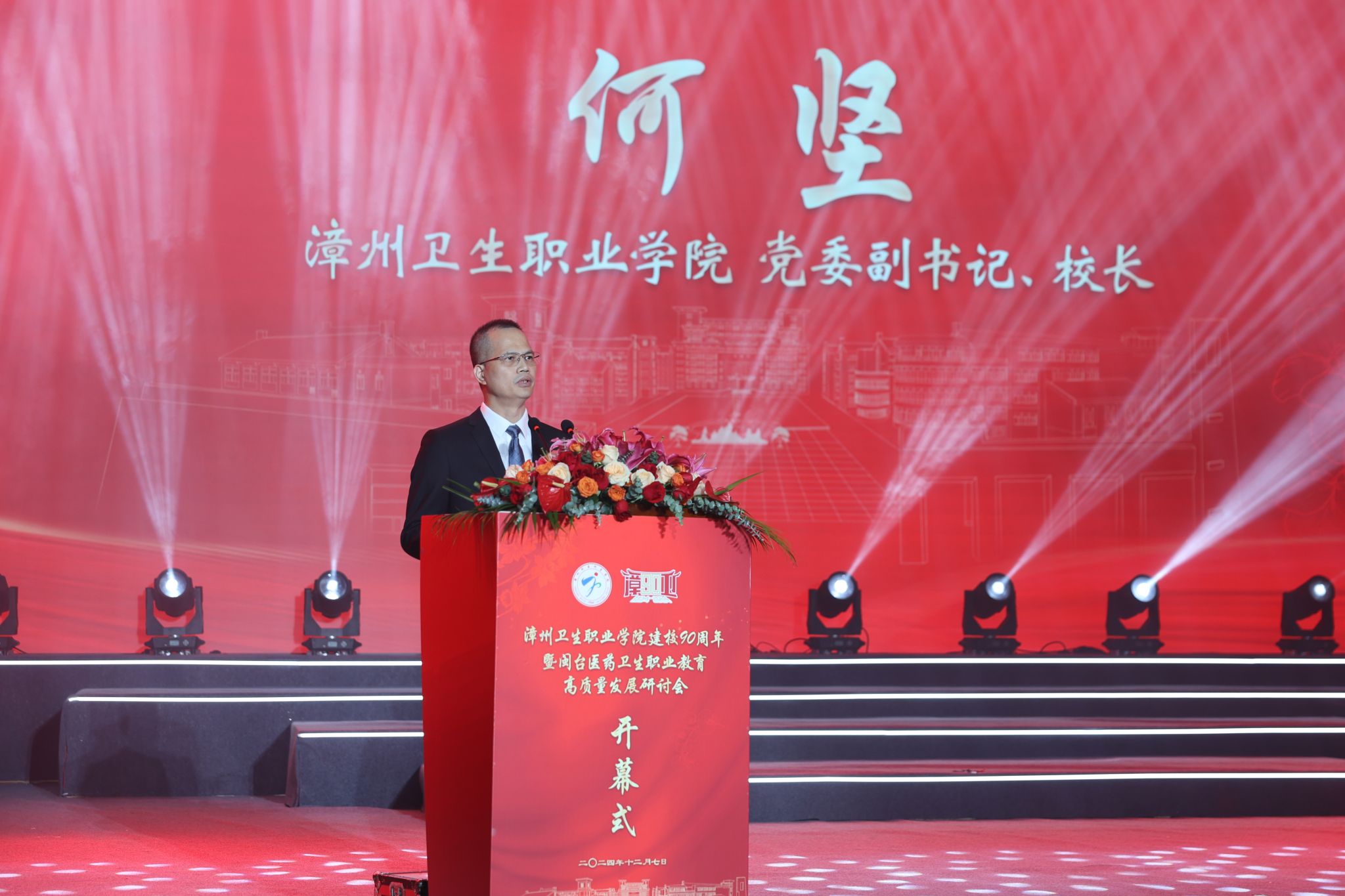 校长何坚在致辞中深情回顾了学校建校90周年暨高职办学20周年来砥砺奋进的光辉历程。他表示,学校90年的办学发展历史,是一部艰苦奋斗、自强不息的创业史。他指出,学校始终坚持“为党育人、为国育才”,强化党建引领,取得一批批标志性成果,累计培养各级各类医药卫生人才8万余名。学校抢抓机遇、攻坚克难,驶入了跨越发展的快车道,建校90周年暨高职办学20周年是学校承前启后、继往开来的重要里程碑,学校将继续秉承“厚德、励志、笃学、尚能”的校训精神,云程发轫,赓续前行,围绕升本的目标去谱写更加恢弘壮丽的百年华章。