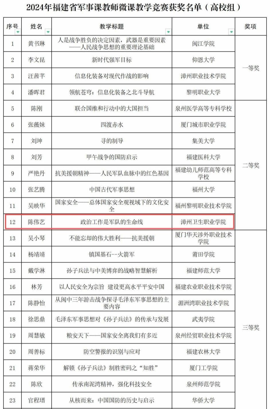 近日,2024年福建省军事课教师微课教学竞赛在仰恩大学举办。此次比赛分为高等院校组和高中阶段学校组两个组别,共有全省84名军事课教师参加此次竞赛。我校马克思主义学院教师陈伟艺凭借《政治工作是军队的生命线》一课,荣获高校组二等奖。