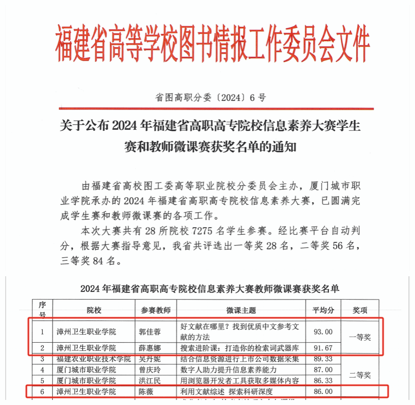 近日,由教育部高等学校图书情报工作指导委员会高职高专院校分委员会、高等教育文献保障系统(CALIS) 管理中心主办的第六届全国高职高专院校信息素养大赛获奖结果公布,我校获评2024年全国高职高专院校信息素养大赛“最佳组织奖”,福建省高职高专院校信息素养大赛“最佳组织奖”,图书馆馆员入围国赛并获得教师微课赛全国赛三等奖、先进工作者。