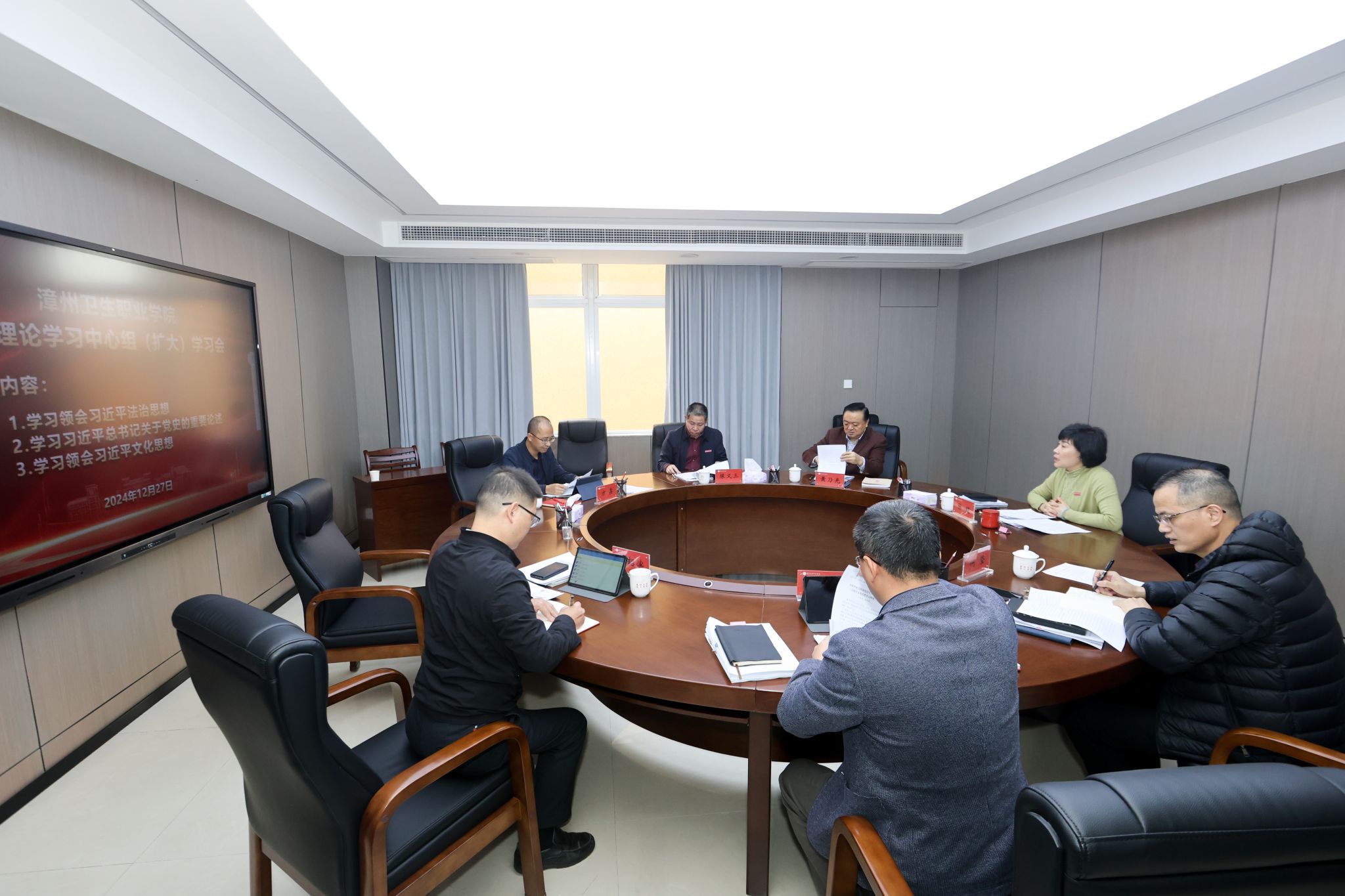12月27日上午,我校在行政楼第一会议室召开党委理论学习中心组学习会,专题学习意识形态工作相关内容,包括习近平法治思想、习近平总书记关于党史的重要论述以及习近平文化思想。会议由党委书记陈超主持,在家党委委员参加。