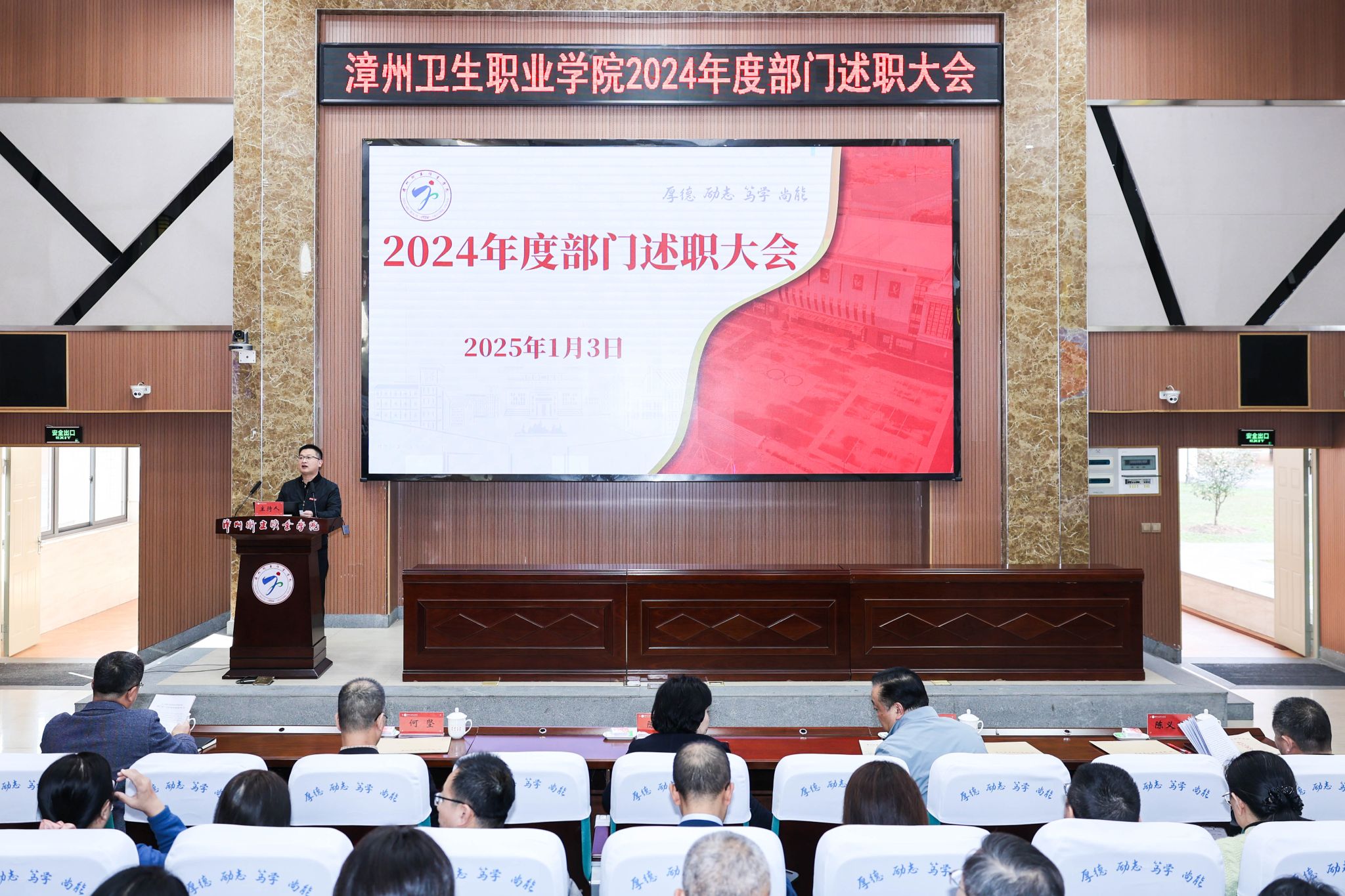为总结2024年学校各部门工作成效,明确2025年工作目标,凝聚合力推动学校内涵式发展,1月3日,我校在学术报告厅举行2024年度部门述职会议。学校全体校领导出席会议,副校长蔡韶滨主持会议。