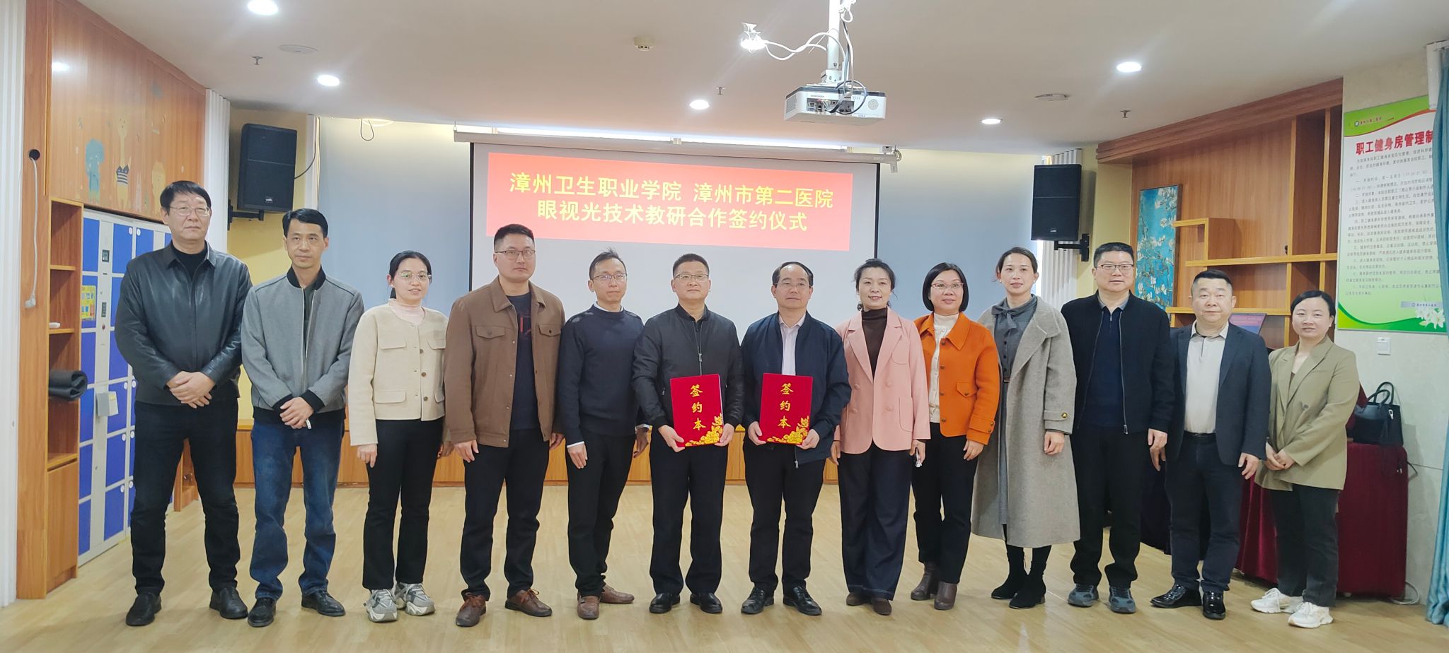 为积极响应教育部等六部门关于印发《职业学校校企合作促进办法》的通知,进一步加强校企合作落地,实现产学研协同育人,提高漳州市青少年儿童近视防控质量。1月21日,漳州卫生职业学院眼视光产教融合基地揭牌仪式暨眼视光技术教研合作签约仪式在市第二医院举行,副校长蔡韶滨,龙海区卫健局党委委员、一级主任科员汤文辉,漳州市第二医院党委书记黄育苹、院长杨益民等双方代表一同参加仪式。