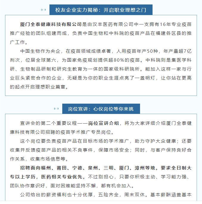 临床医学院由院领导带队走访漳州5家社区卫生服务中心,加强双方合作,共同培养更多优秀的高素质人才;医学技术学院召开就业创业动员大会,院领导解读健康中国战略下的大健康产业机遇,专业带头人分板块剖析检验、影像等技术领域发展趋势;中医与康复学院建立"就业导师+专业教师+辅导员"三维指导体系,将岐黄文化传承与职业生涯规划有机融合。