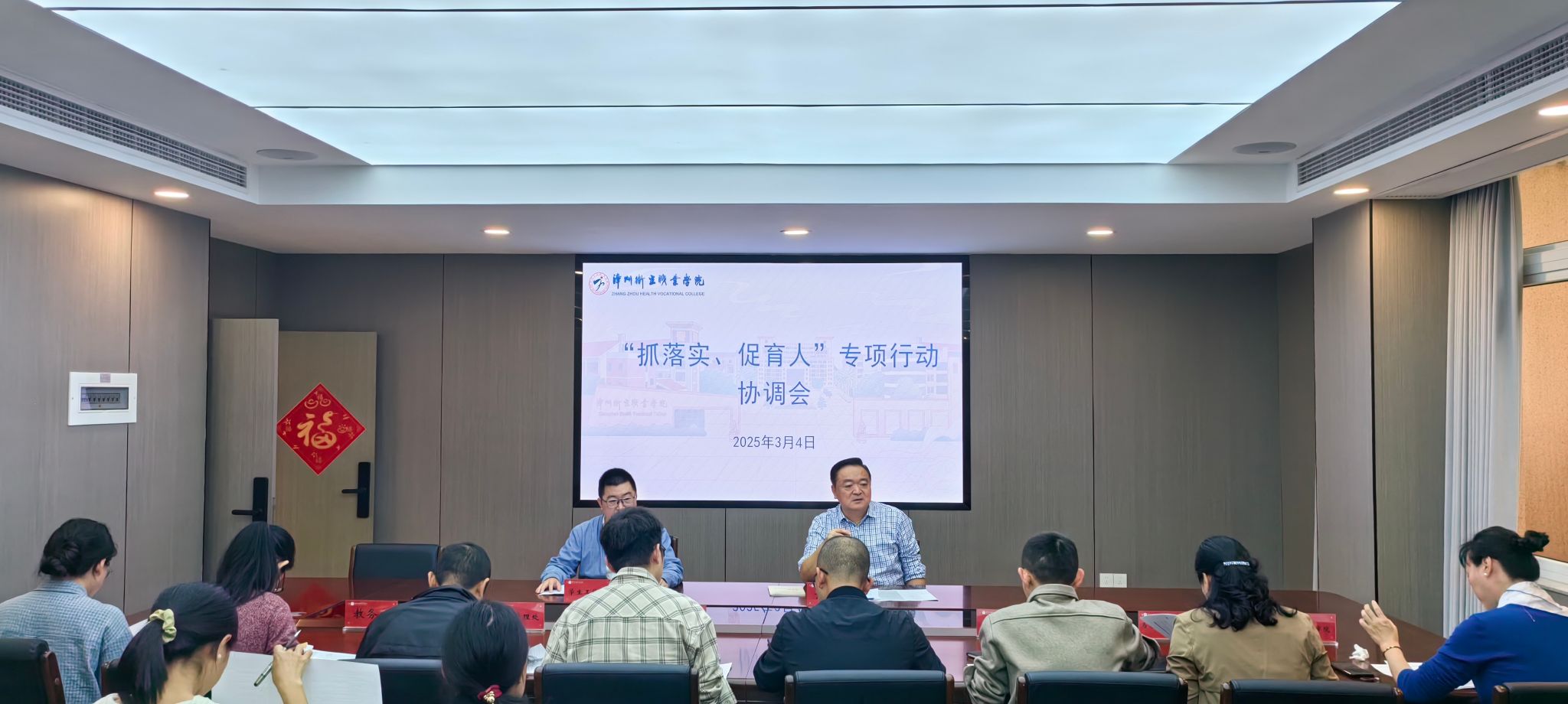 为深入贯彻落实党的二十届三中全会和全国教育大会精神,落实立德树人根本任务,提升学校育人质量,3月4日,学校召开“抓落实 促育人”专项行动协调会。校党委副书记黄乃光出席会议,相关职能处室及二级学院负责人参加会议。