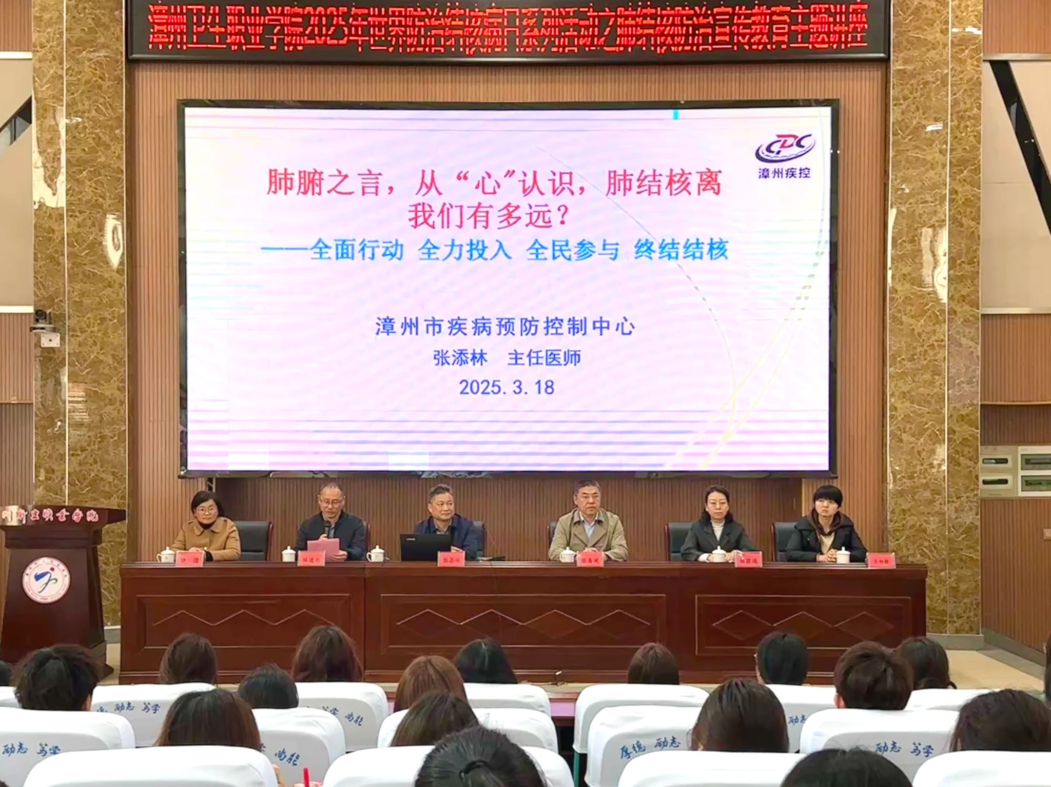 在世界防治结核病日来临之际,3月18日,我校邀请漳州市疾病预防控制中心主任张添林到校作专题讲座。副校长张春斌、临床医学院党政班子成员、“‘治’同道‘核’医路有我”志愿服务队队员及部分学生代表到场聆听。