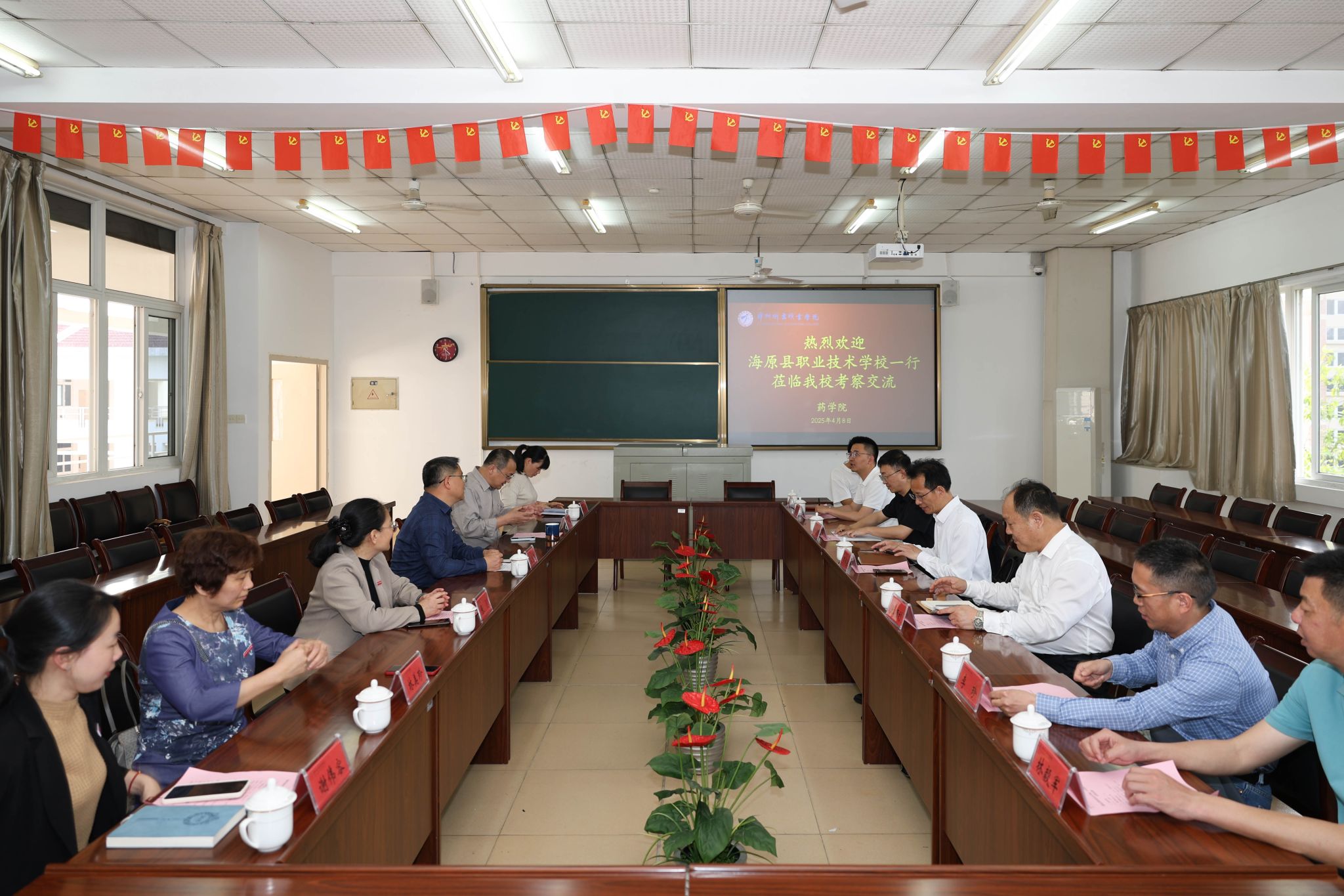近日,海原县职业技术学校校长罗伟强一行莅临我校考察交流,校长何坚、纪委书记宋志海、党政办主任、药学院党政领导班子及相关人员陪同参加。