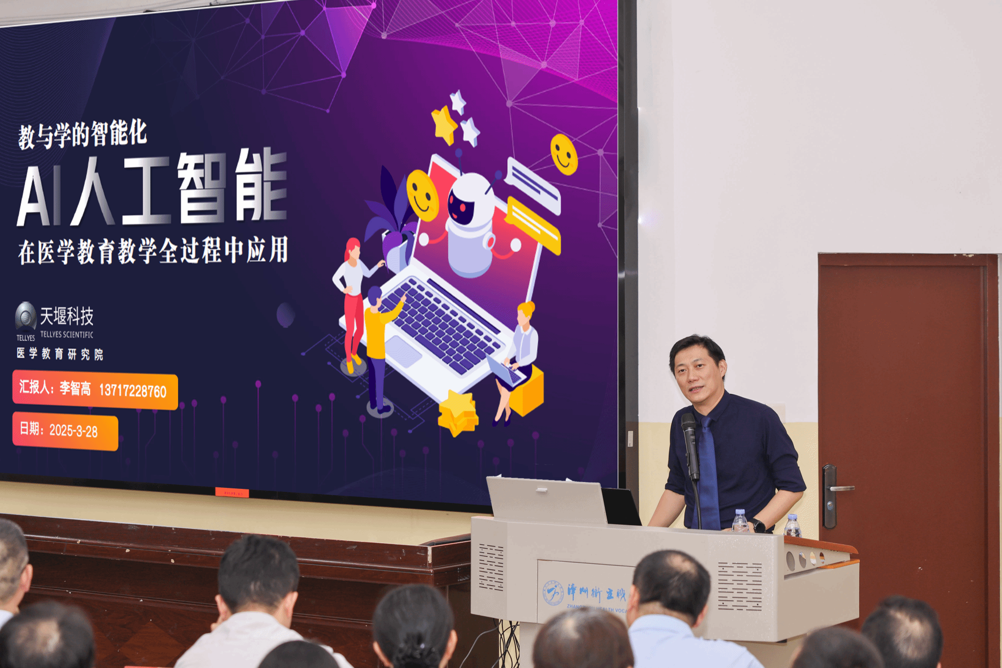 天堰科技股份有限公司天堰医学教育研究院执行院长李智高副教授受邀莅校辅导,他从人工智能技术的发展趋势入手,深入浅出地剖析了其在医学职业教育教学全流程中有关资源建设、课堂活动、作业评价教学诊改等方面内容的应用,强调了人工智能赋能教师职业发展的重要性及其将为医学职业教育带来的深刻变革。