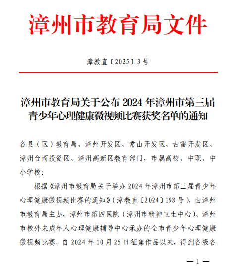 近日,漳州市教育局公布第三届青少年心理健康微视频大赛获奖名单,我校选送作品荣获二等奖5项、三等奖1项。